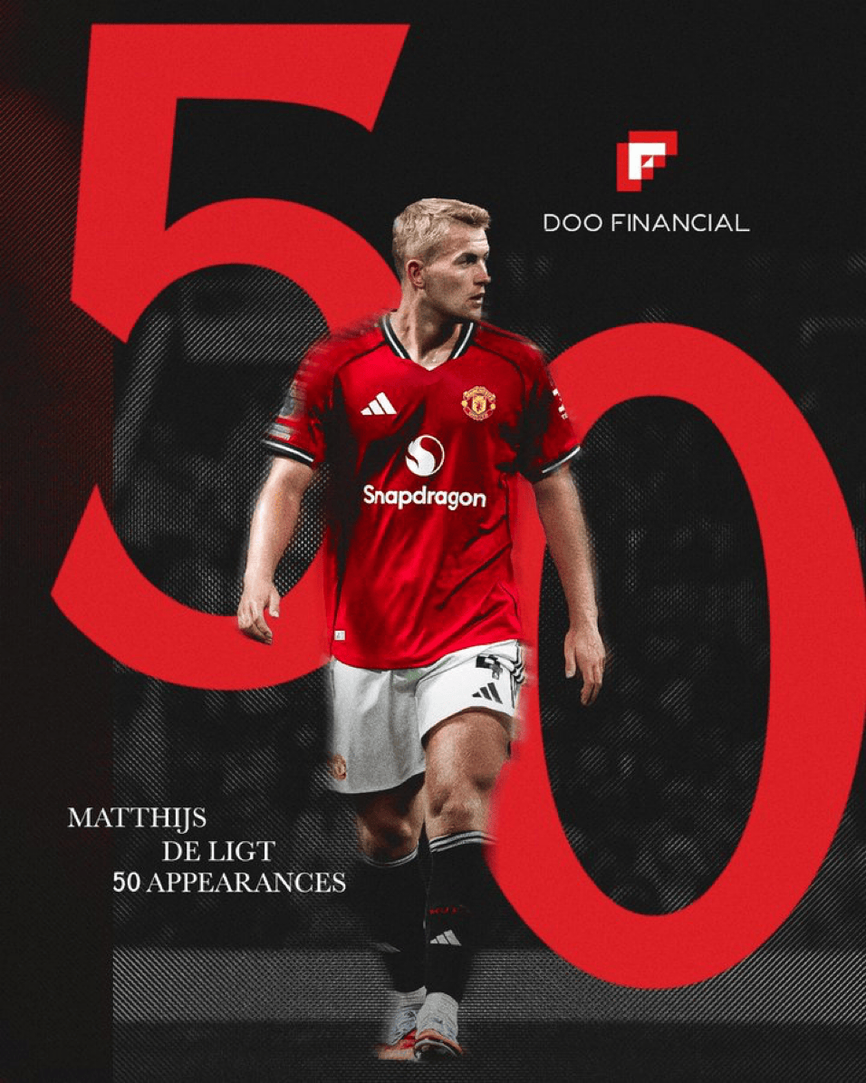 这是德里赫特曼联生涯的第50场比赛,俱乐部官方发布海报纪念了这一里程碑时刻。