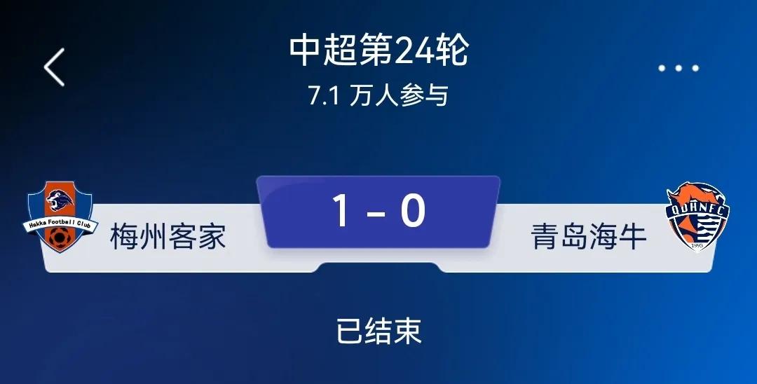 青岛海牛今晚又输了保级大战,梅州客家1比0青岛海牛,拿下保级6分大战,梅州客家一