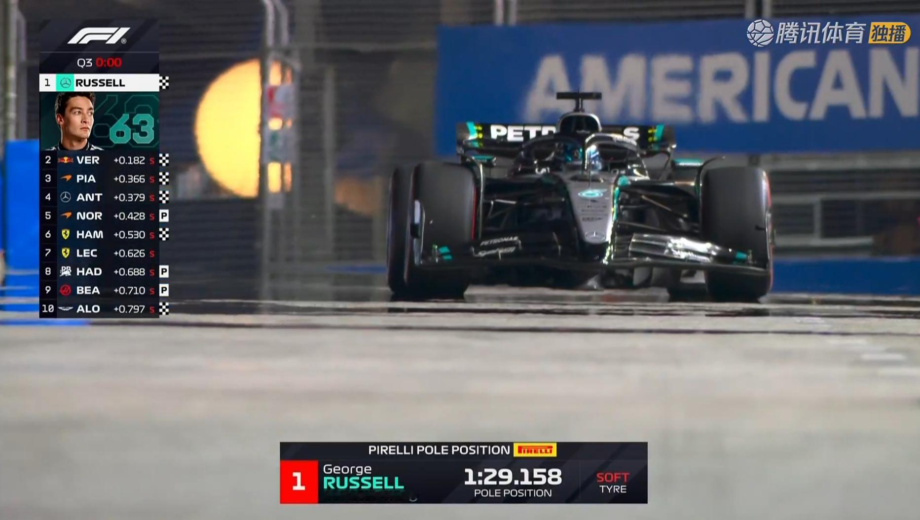 拉塞尔Q3两个飞驰圈都足以确保杆位 1:29.158刷新了新加坡滨海湾赛道单圈纪录!这是英国人职业生涯第7个杆位,梅赛德斯自2018年之后首次在新加坡夺杆!