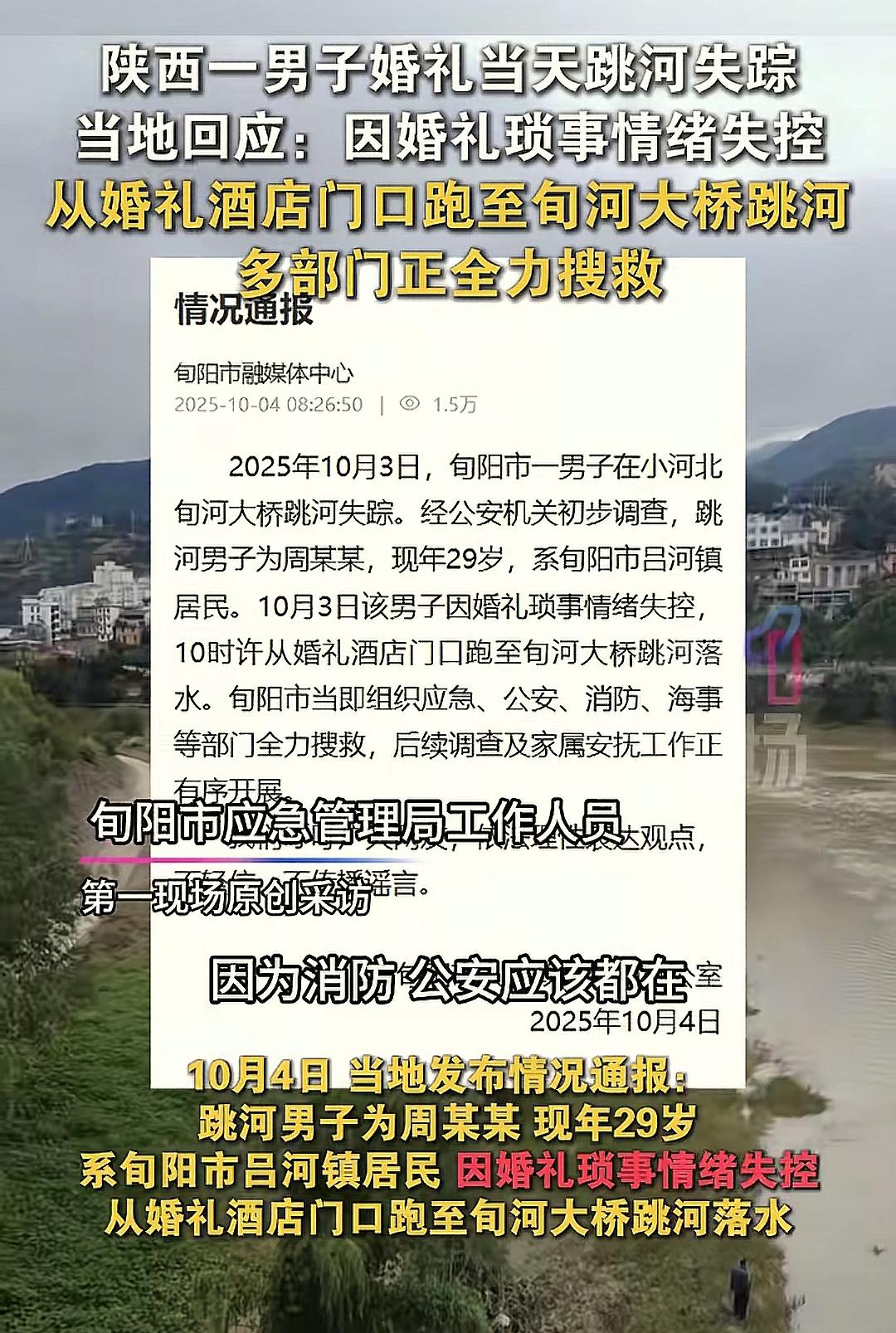 陕西旬阳一位29岁的新郎, 在婚礼当天选择跳河自杀, 让人既痛心又惋惜。他是研究生学历,还是一名教师, 本该有着稳定的生活和光明的未来, 可偏偏在人生看似圆满的节点, 走到了这一步。 听说他工作没几年, 积蓄有限, 父母是老实人, 为了他的婚事几乎倾尽所有。 能让这样一位受过高等教育、本该懂事的年轻人绝望, 背后肯定藏着难以承受的压力, 只是没人知道, 最后那根压垮他的稻草究竟是什么。 其实不管遇到多大的坎, 生命永远是最珍贵的。 哪怕当下有解不开的难题, 只要活着就有改变的可能。 希望大家都能多关注身边人的情绪, 也希望这样的悲剧不再发生。 你觉得面对生活中的巨大压力, 我们该如何及时调整自己的心态呢?