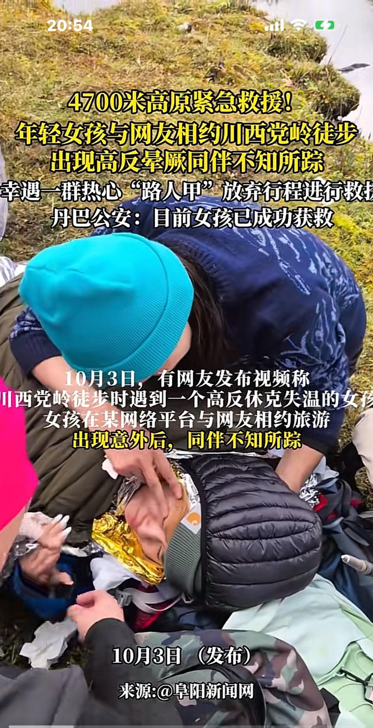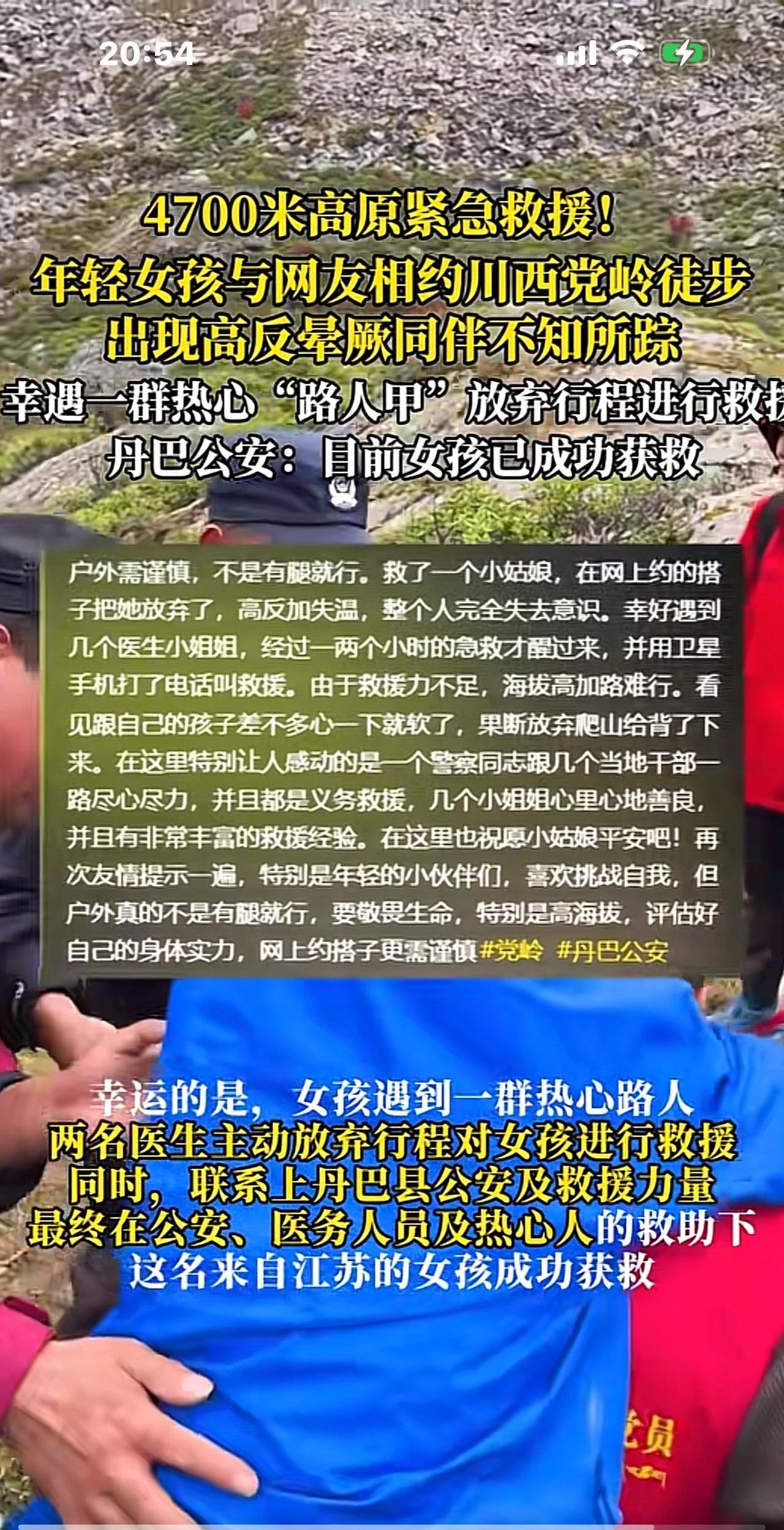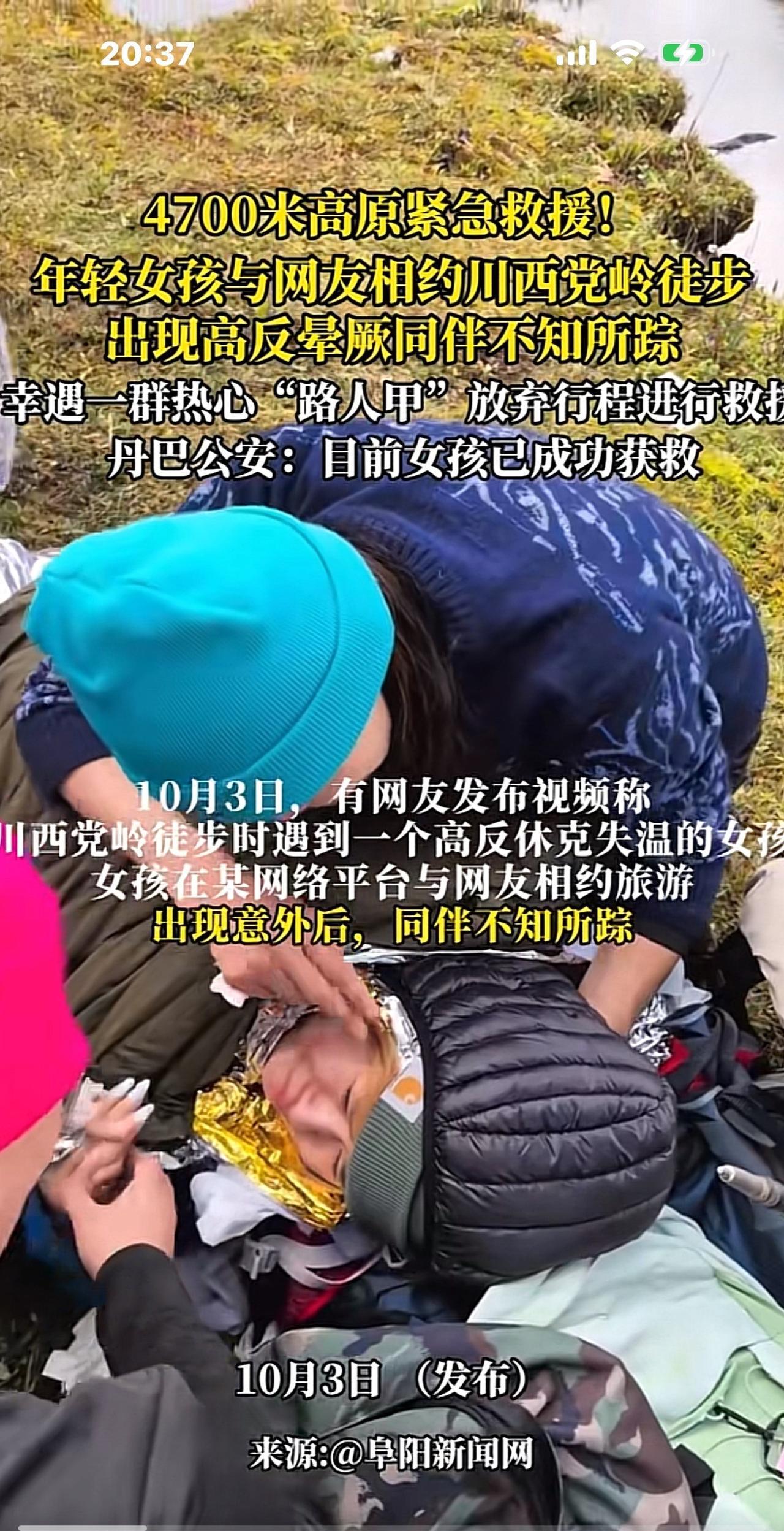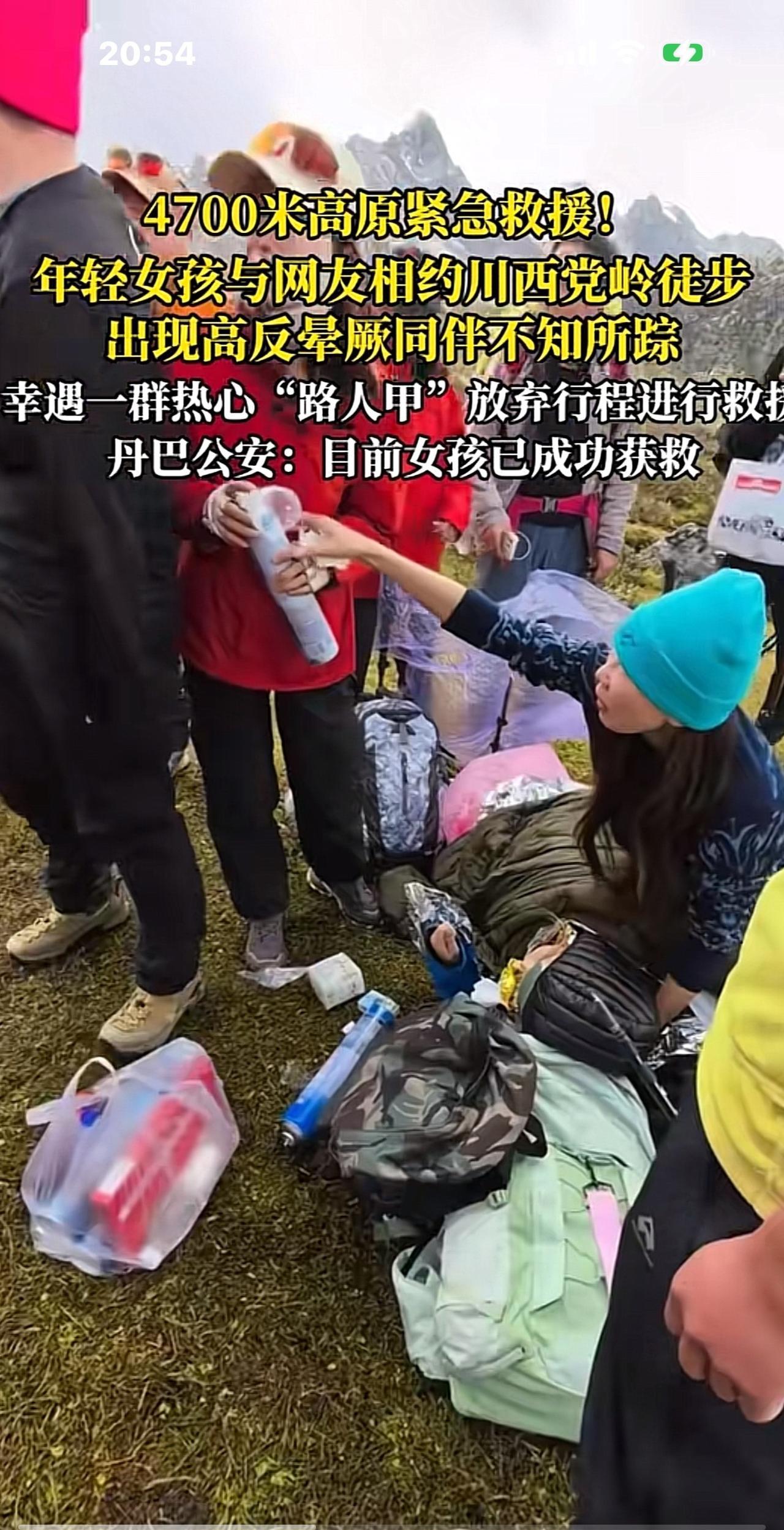 一名女孩网约“搭子”徒步。 在海拔4700米处高反,搭子丢下她跑了。 女孩失温,差点丧命! 事发于10月2日,一位年轻女孩在某红书上约了一位搭子,前往川西甘孜党岭徒步,两人相谈甚欢。 党岭风景区海拔从3000米到5470米不等。其中,党岭村海拔约3600米,飞机坪海拔约3800米,葫芦海海拔约4200米,大海子(卓雍措)海拔4300米,主峰夏羌拉海拔5470米。 女孩和搭子爬到卓雍措往上,海拔4700米处出现严重高反,她头痛欲裂,呼吸困难,爬不动了,没法继续前进,甚至开始出现意识昏沉的状态。 结果刚才还和女孩说说笑笑的搭子不知所措,自己走了,甚至连个急救电话也没帮她打一下。 山里温度低,只有10来度,女孩很快倒下失温了,差点命丧党岭,所幸她命不该绝。 另一支徒步队伍路过,其中有两名队员是医生,他们及时施以援手,给女孩裹保温毯、掐人中、提供氧气,还及时拨打了救援电话。最终女孩获救。 女孩倒下被发现时的画面看了让人心痛,她表情看起来很痛苦,她染了金色长发,美甲又尖又长,打扮有点像卡通里的人物,年纪不大。 当好心人给女孩裹上毛毯穿上羽绒服,她意识有所恢复时,虚眯着眼睛,感受到周围浓浓的善意,眼睛睁开了,痛苦的表情才有所缓解,那一刻,是幸运,是幸福,是侥幸存活的快乐,让她舒了一口气,她喜极而泣。 据说由于山路陡峭,2个小时路程,后来女孩是被几个民警一路换着背下山的,目前女孩身体没有大碍,恢复不错。 点赞热心救助女孩的路人们,点赞我们的帽子叔叔! 最后提醒大家,不要轻信网上刚结识的人。每个人适应高海拔因人而异,不是有两条腿就可以去的,要敬畏大自然,去时要做好充分准备,不行就要适时下撤,否则可能丢掉性命。 [赞][赞][赞]