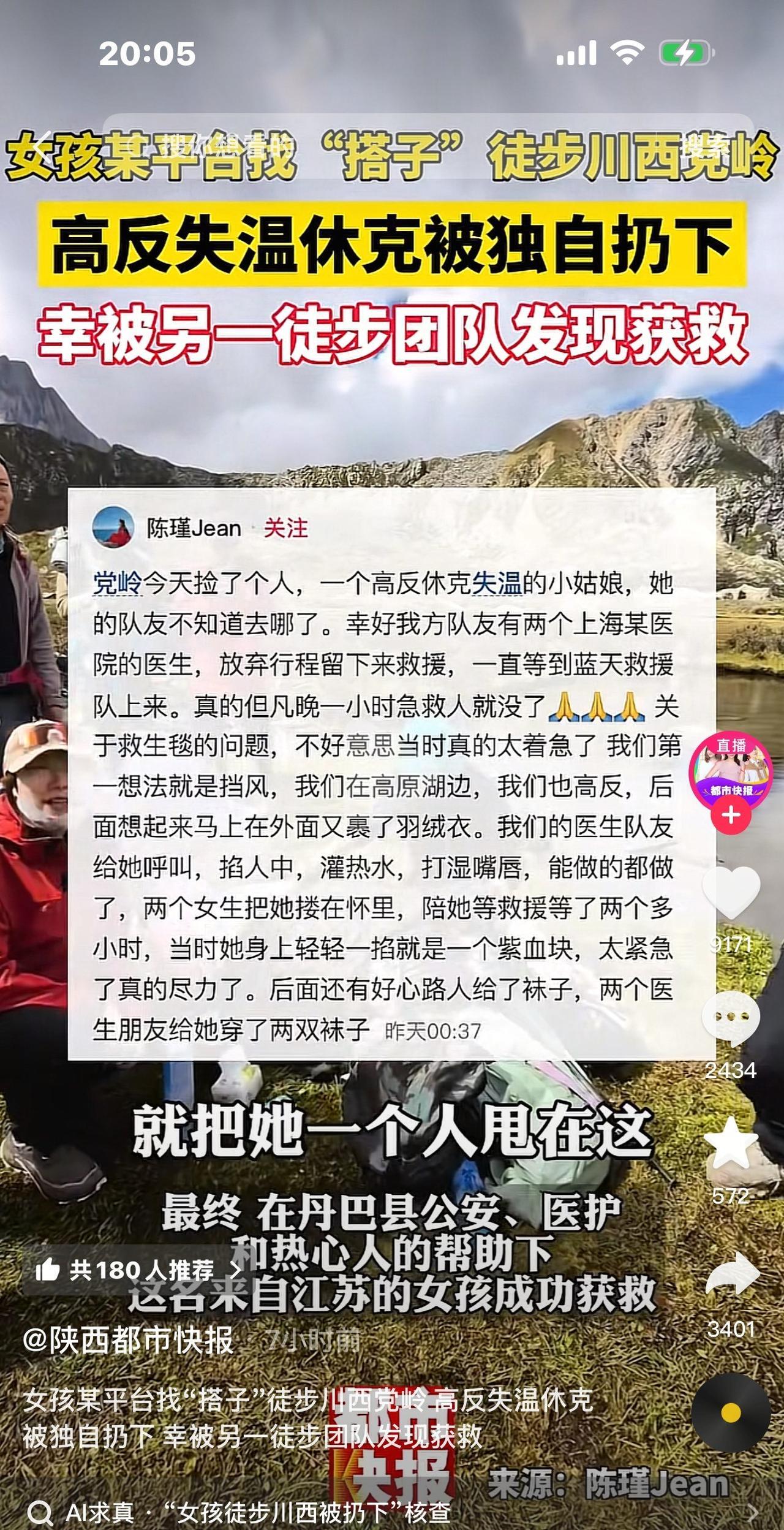 一名女孩网约“搭子”徒步。 在海拔4700米处高反,搭子丢下她跑了。 女孩失温,