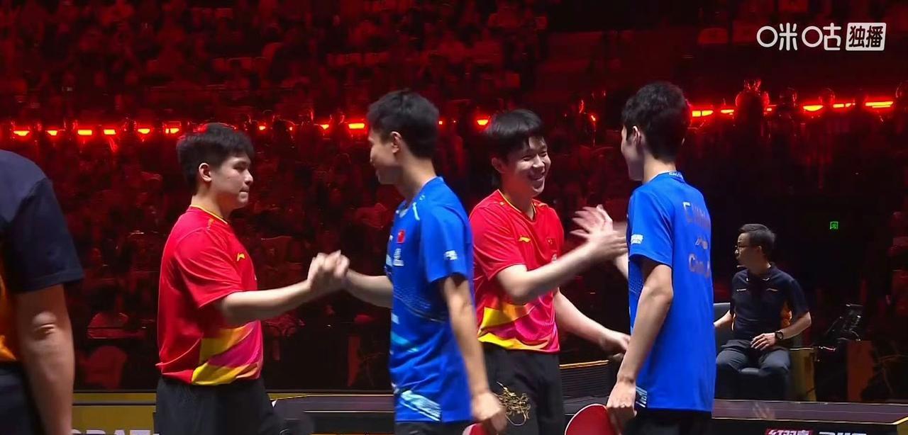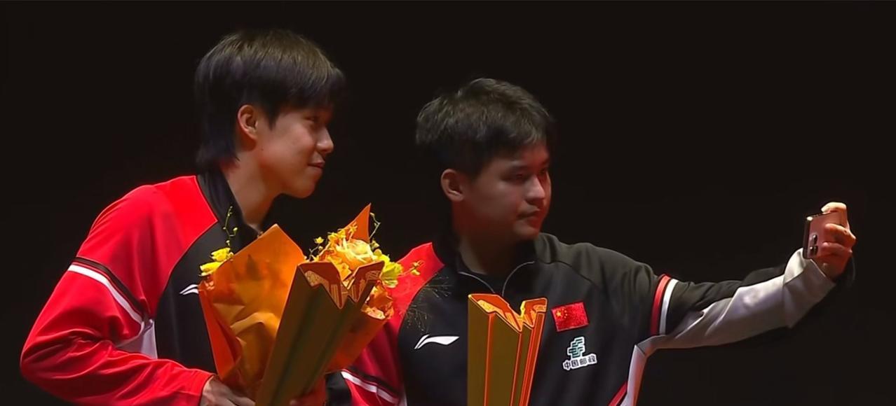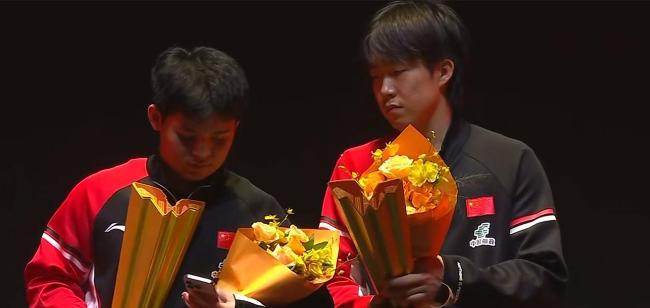 王楚钦已经拿到两个金色冠军奖杯了。 今年的中国大满贯赛,王楚钦是身兼三项,现在王楚钦已经拿到混双和男双的冠军,拿了两个金色奖杯,不过他把捧花都扔给现场的球迷了。 今天的男双比赛,也是国乒的内战,两对组合打的也都很释放。在男双冠军自拍环节,也发生了有趣的一幕,王楚钦看到工作人员走过来,就示意工作人员把手机给林诗栋,林诗栋拿过手机后,手里都拿满了东西,没法拍照,后面还以为楚钦伸手去拿手机,结果是帮小石头拿花了,小石头拿着手机走到头哥的前面,两个人开心的拍了冠军照。 去年的中国大满贯赛,王楚钦/梁靖崑拿到了男双冠军,今年王楚钦和林诗栋拿到了男双冠军,他的双打真的厉害。这次比赛,看到林诗栋在双打时也很积极,跟头哥配合的也好,采访中林诗栋说头哥也跟他聊了很多关于双打方面的,俩人也是配的越来越好,以后想和头哥多打男双。