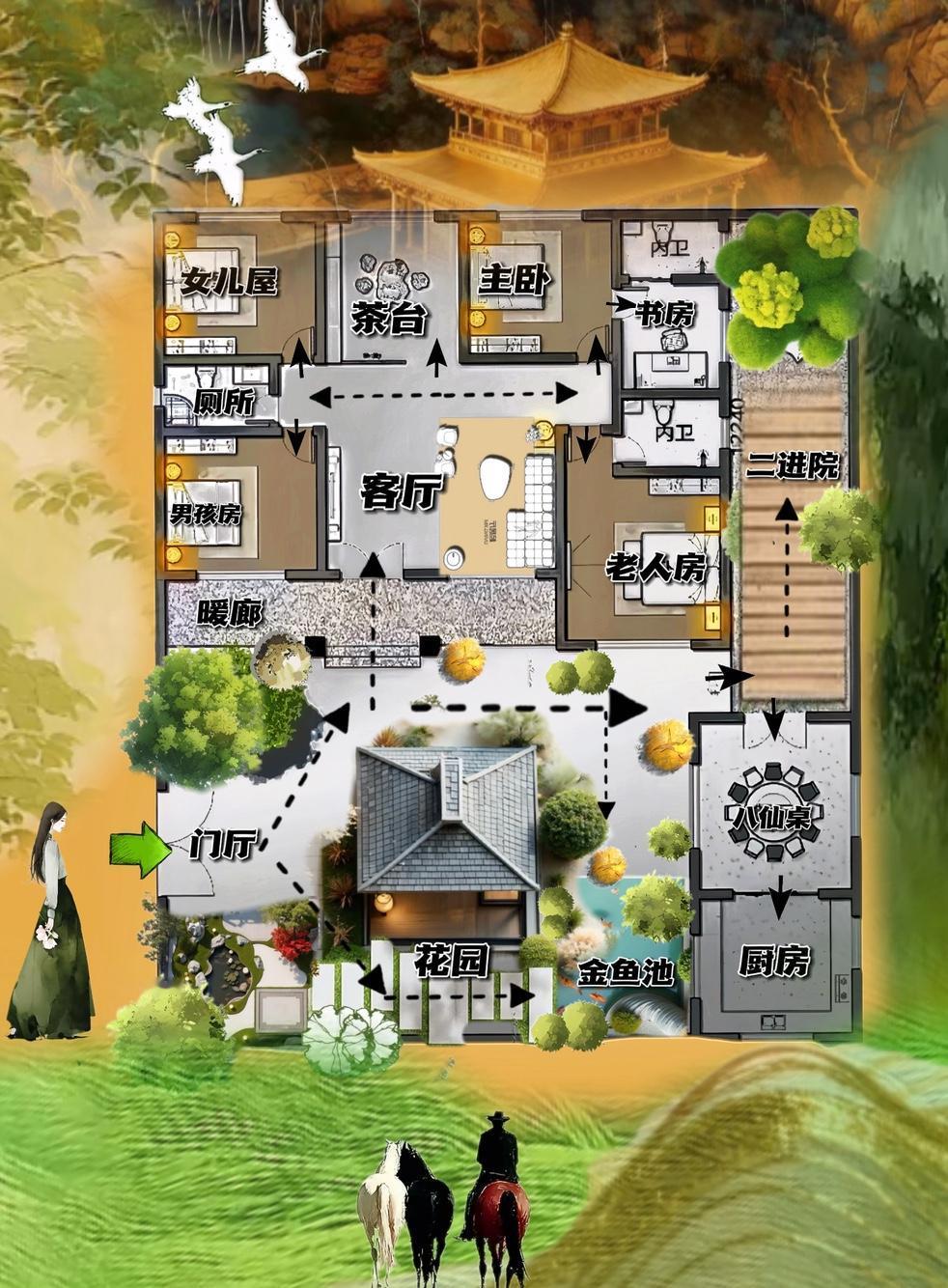 优秀的二进式,不省心的四居室,我说460㎡最擅长,诗和远方,不通达人情世故。 合院走一条,冷落布局,成全二进院落的通路,修出最接地气的场景! 场面不大,意境却最成功! 一进院,有山有石有水,有灵性。二进院,有花有木,做背景板。各有千秋,四个卧室很凑齐,三代同堂没啥问题,最大的毛病就是没收纳,柜子少,厕纸也太小器啦! 没整出一个三分离,与四合院气质,不匹配! 感觉没16㎡茶室,撑场子,合院只能靠暖廓,打点门面。 虽然整体动线和布局,很土气,左手的餐厨没走样,完成老祖宗留下的其实的美! 是不是如此有残缺布局的美,才是真实的美! 院子很重要,动线跟不上,客厅不露脸,老是按老辈子的生活习惯,整出一亩大宅子,这个格局你喜不喜欢? 院子有意境,洄游动线妙,布局逻辑清晰做的滴水不漏! 在地气和韵味,两个字,你让哪家红!
