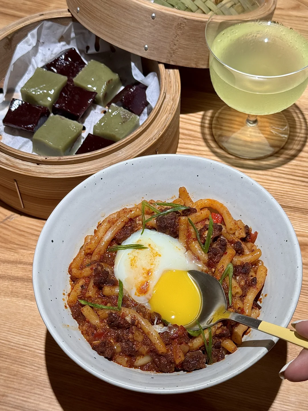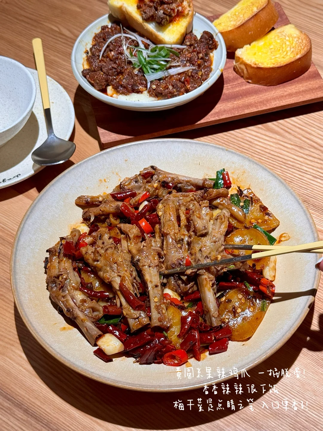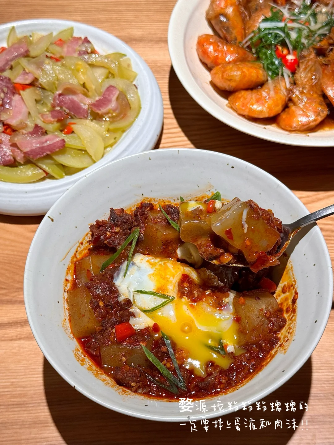 我们点了江西空心粉配温泉蛋 蛋液裹上卷粉梗啾啾的很弹牙~还有腊味青番茄、碎椒牛肉配吐司、梅干菜辣鸡爪…真的jujuju下饭!已经列为我和姐妹可以一周去3次的宝藏小店了😭