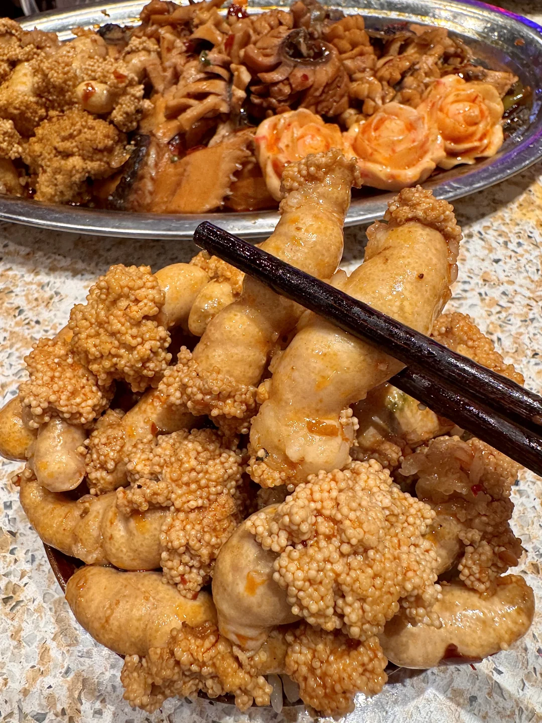 这家📍李莫颠)主打鱼蛙火锅,饭点座无虚席……强推这个贡椒仔姜红油锅 热油上桌现泼滋滋作响 越煮越香没有苦味!!鱼籽鱼泡馋到口水直流🤤鱼泡爽脆有嚼劲,鱼肉切过花刀后更入味!空口吃或者蘸酱都是极品!!