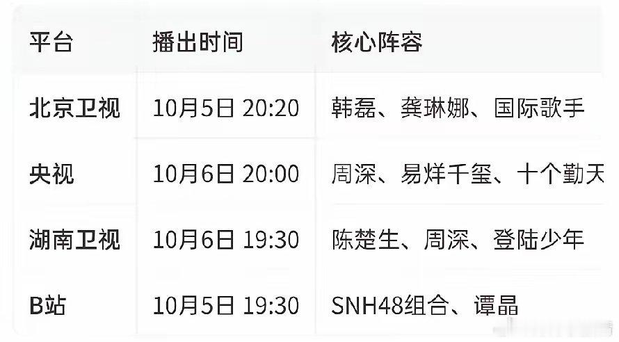 目前,我看到今年有六台中秋晚会,主要集中在5号(八月十四)和6号(八月十五)播出,分别是央视、北京、湖南、河南、上海、B站。