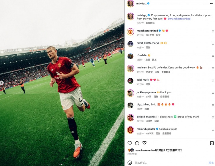 本场比赛德里赫特首发出场迎来曼联生涯50场里程碑,赛后他也在社媒晒照写道:“50次出场,拿下三分,感谢从始至终都支持我们的球迷们!”