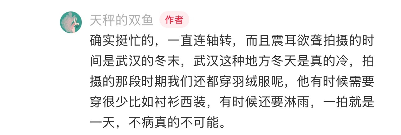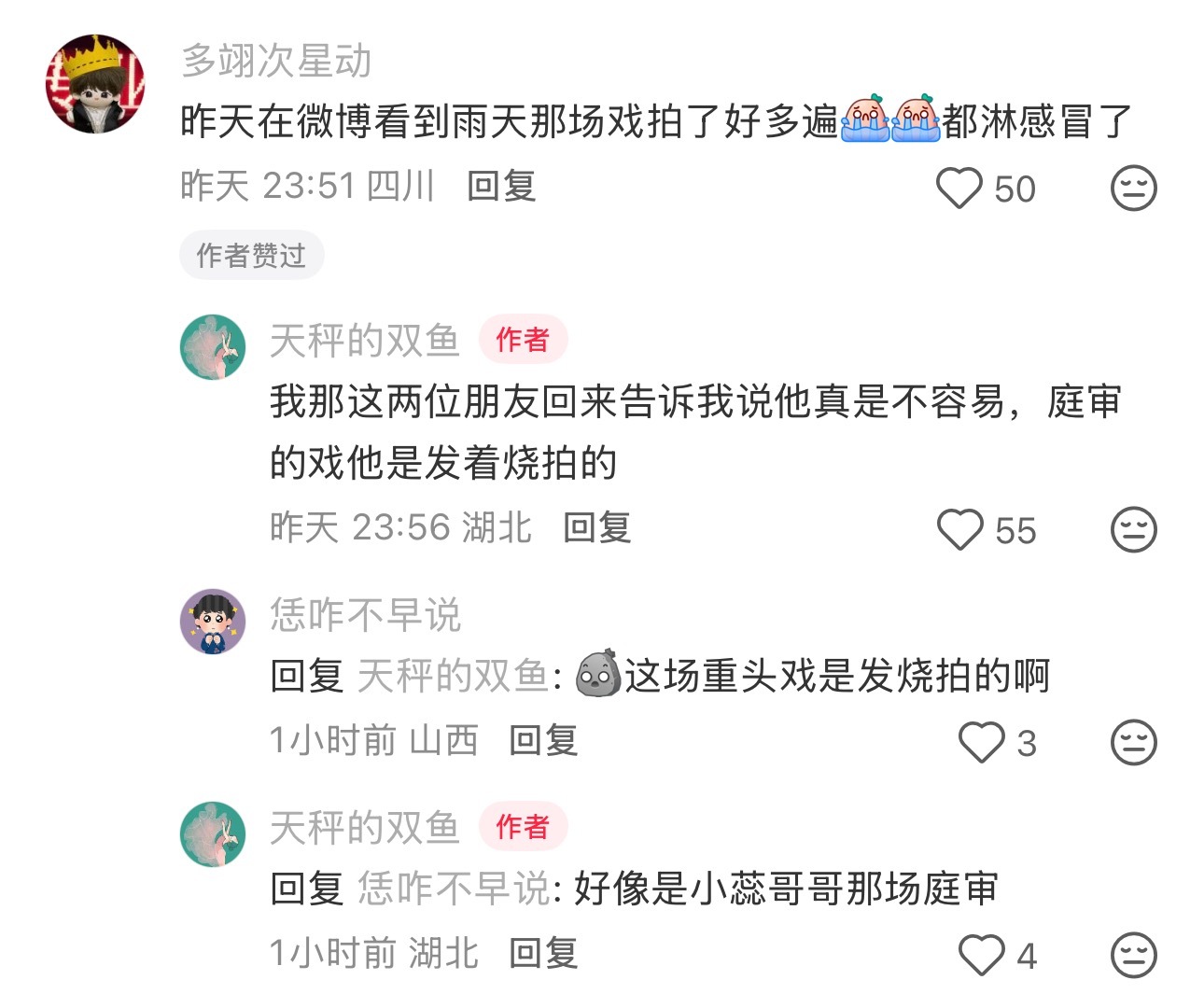 小蕊哥哥那场庭审戏是发着烧拍的,爆炸的戏从头天晚上8点拍到第二天早上6点…,看到一个视频是他一边淋雨一边在不停的练习手语,都冻到咳嗽擤鼻子了…