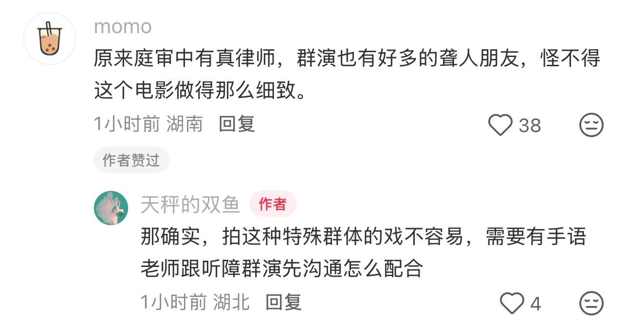 还提到了震耳欲聋里请了聋人朋友当群演,也请了真的律师拍开庭戏