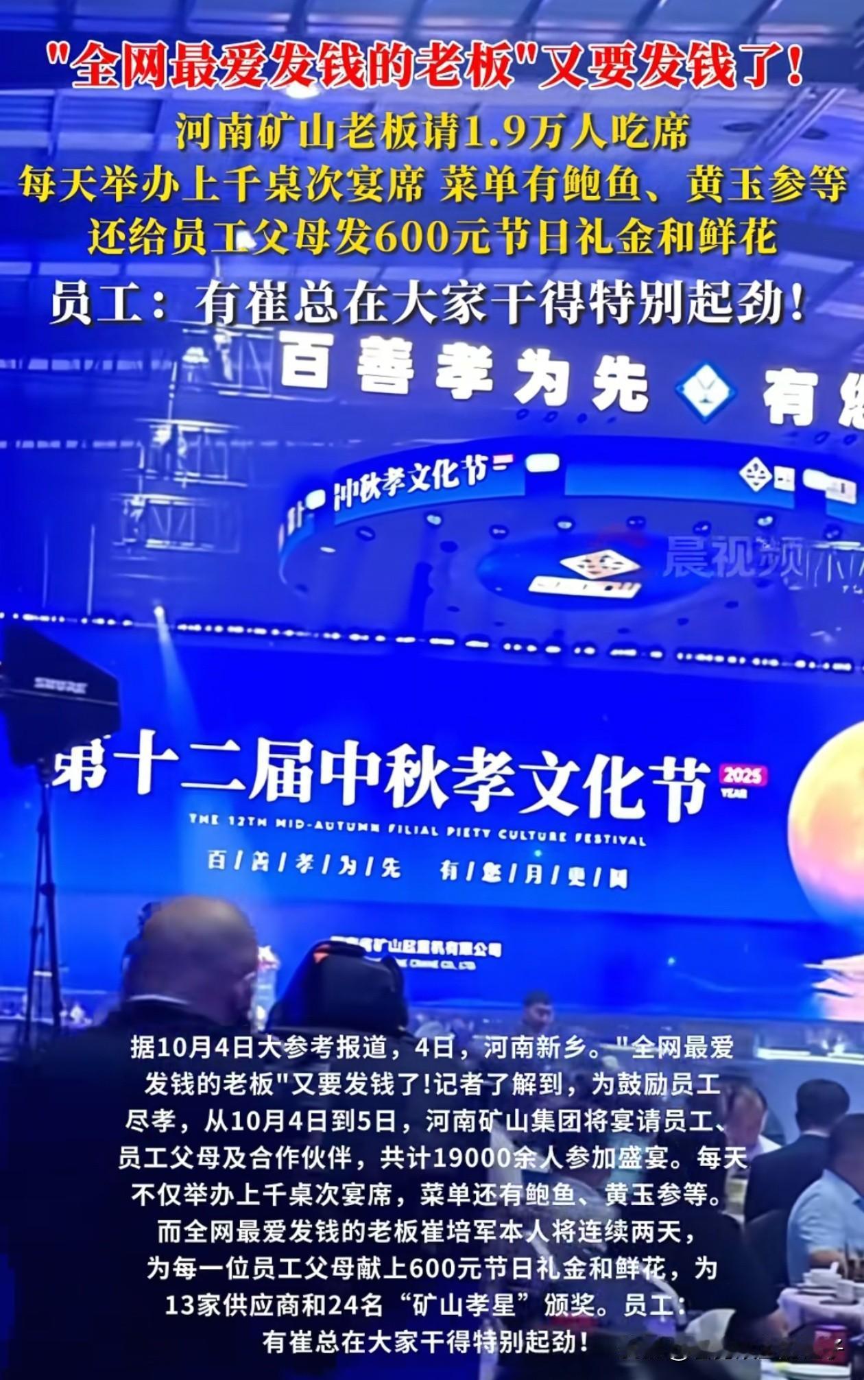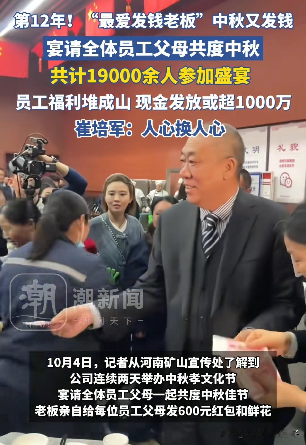 这个老板火了! 全国人都知道他对员工有多好了, 河南矿山集团的崔培军在公司举办的中秋宴会上,分享了一个小故事,他说前段时间有个员工来找到他借钱。 这个员工在老家谈了个女朋友,但他的女朋友要让他老家修套房,还要在城里买套房,不然就不订婚,这事就黄了。 总的算下来还差15万,所以这个员工就找到了崔总,想要先借钱把婚结了,以后再慢慢从他工资里面扣。 没想到崔总在核实了情况后,直接发话让财务给那个员工转了20万,崔总说人生大事最重要,先去把女朋友娶回家! 不仅如此,这次矿山集团举办的中秋孝文化节,不仅邀请了员工和他们的父母来吃大餐,还准备了600元的现金红包,整个活动预计花费上千万元,这个传统矿山集团已经保持了12年! 有这样的老板简直太幸福了,平时没事就爱发钱,还管你的人生大事,估计再也找不出第二位了。
