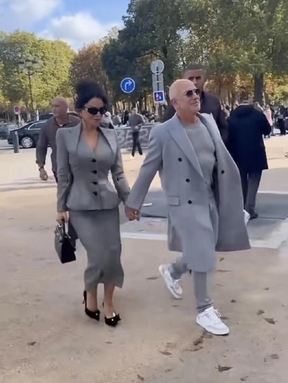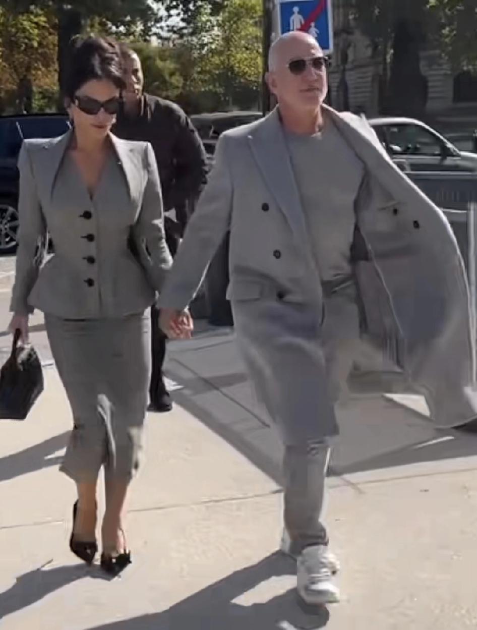171的贝佐斯穿中长款大衣大步流星,贝佐斯蹬恨天高小碎步紧捯饬地跟着,两人都穿了不属于他们以往风格的衣服。 巴黎时装周怎么能少了桑切斯夫妇的身影呢,两个这么爱秀的人。 结婚后,贝佐斯头发都白了,紧身毛衫下的身材倒还比较健硕。 桑切斯包裹严实,这套灰色洋装穿出了五五身效果。 掐腰设计更添柔弱,纤腰扭动如风摆柳荷。 看来这手是可以牵一辈子了,贝佐斯连穿衣风格都趋向“桑切斯”化,可见她对他影响太深了。