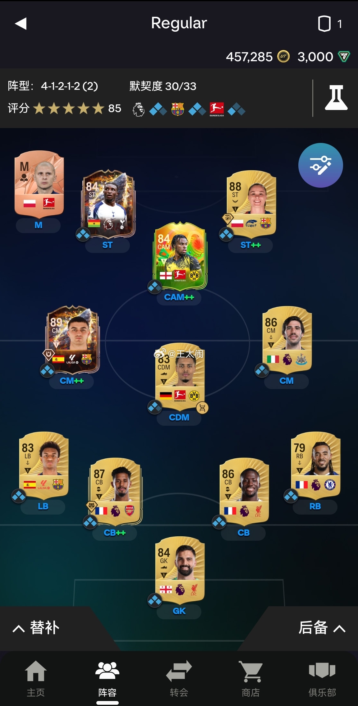 41212菱形中场,目前来看只能算一个折中方案,顾前不顾后的打法,一旦几次进攻不进,就陷入被对手连续反击的巨大压力中,下周得考虑练一个防守稳固的阵型了,4411或者4231
