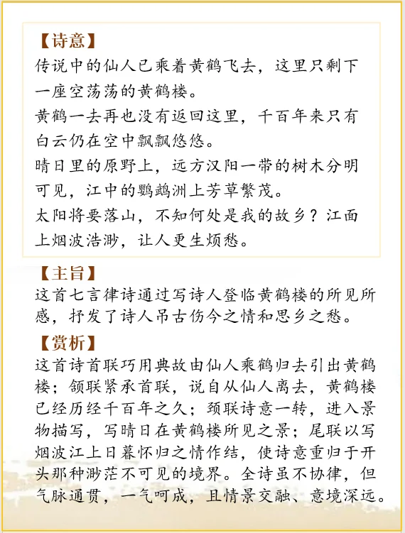 这首七言律诗通过写诗人登临黄鹤楼的所见所感,抒发了诗人吊古伤今之情和思乡之愁。