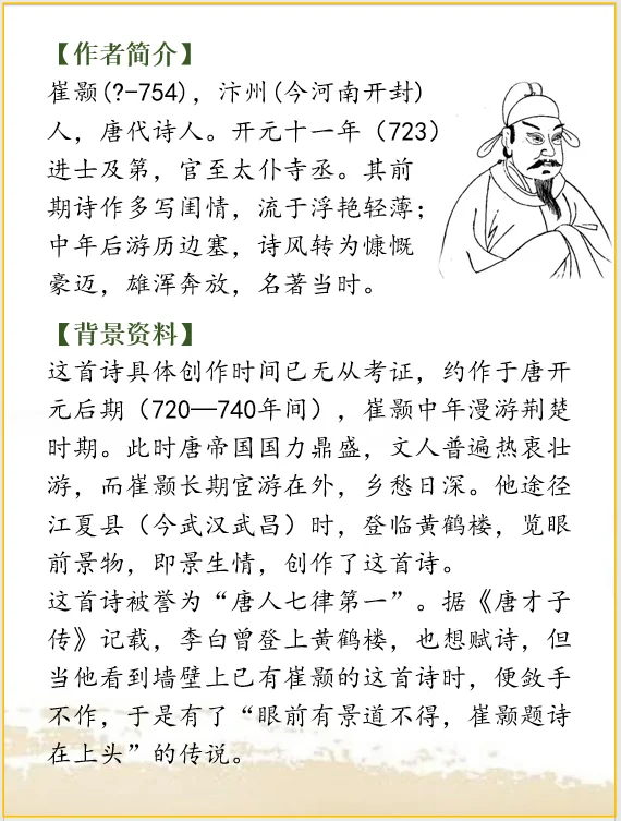 这首诗具体创作时间已无从考证,约作于唐开元后期(720—740年间),崔颢中年漫游荆楚时期。此时唐帝国国力鼎盛,文人普遍热衷壮游,而崔颢长期宦游在外,乡愁日深。他途径江夏县(今武汉武昌)时,登临黄鹤楼,览眼前景物,即景生情,创作了这首诗。