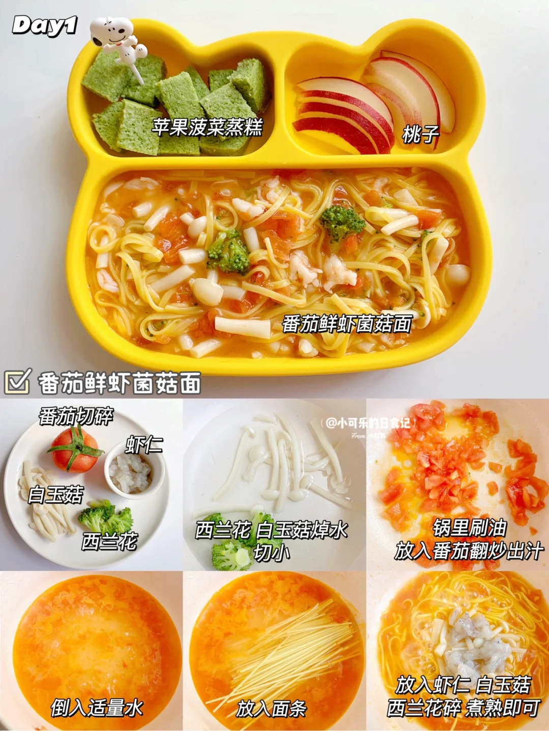 食材:番茄、白玉菇、虾仁、西兰花、面条