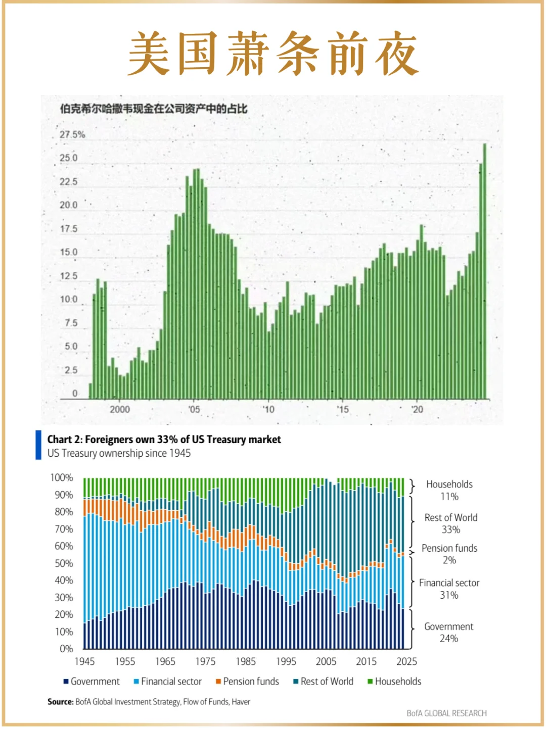 3. 值得注意的是,伯克希尔哈撒韦的现金持有比例已经接近40%,绝对的历史高位。资本市场上如果只有一条定律,那就是低买高卖,巴菲特的作业还是可以抄的。以往的60/40股债配置也在当前环境失效了,相关性越来越高,市场越来越复杂。如果美国的萧条到来,影响是全球性的,普通人最重要的是确保自己在牌桌上,而不是被一波带走,感觉这个环境下持币观望挺好的。不想下桌的话,可以看看低风险的货币基金和利率债,或者「定投」一些低位的宽基,红利指数,和防御性行业指数基金,多元化分散风险。重要的是买的要低,也不要一波拉满!普通人最重要的是不要出现大的亏损。