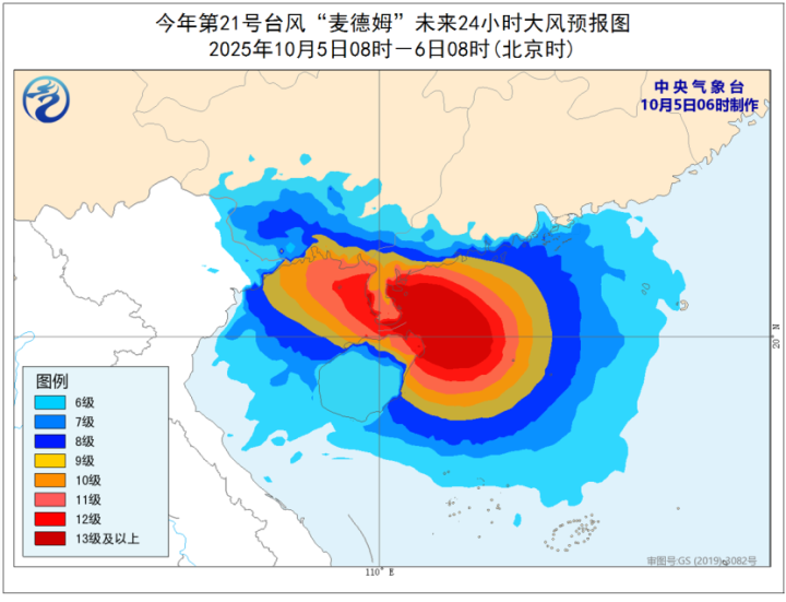 大风预报:10月5日8时至6日8时,南海西北部和中西部海域、东沙群岛、西沙群岛、北部湾、琼州海峡、广西南部及沿海、广东南部及沿海、海南岛及沿海将有6~8级、阵风9~10级的大风,其中,南海西北部海域、琼州海峡、北部湾北部海域、广东雷州半岛及沿海、广西沿海、海南岛东部和北部沿海的风力有9~11级、阵风12~13级,部分海域或地区风力可达12~14级,阵风15~16级。