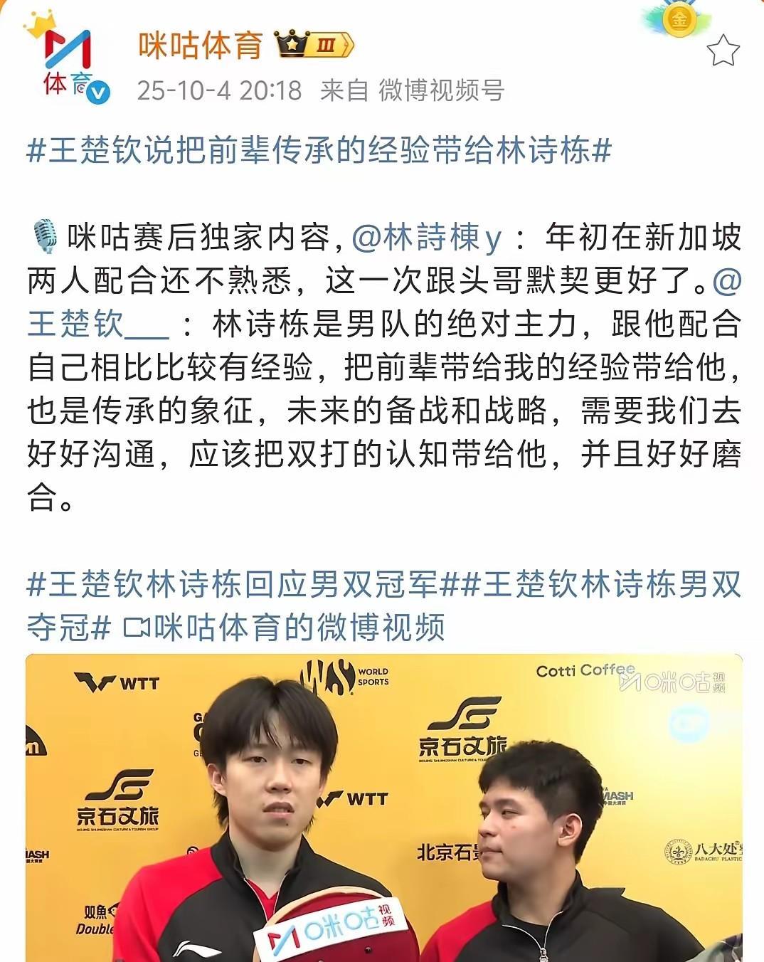 王楚钦太让人心疼了! 王楚钦明明受诟病最多,质疑最多,但是他总想给别人撑伞。 他在做当初马龙做的事情,他在延续国乒优良传统,“传帮带”的工作。 他把他双打的经验带给林诗栋, 他也把自己从前辈那儿带来的经验带给林诗栋, 这是传承的象征! 王楚钦这次双打采访释放了很多信息。 他最后提了三句话: 第一句,和林诗栋配双打是备战和战略, 第二句,自己要把双打的认知带给林诗栋, 第三句,要和林诗栋好好沟通,好好磨合! 以后可别拿别人和他比了,也别拿他和别人比。 根本不在一个层面上,王楚钦是一个顶好的人! 是他在男队青黄不接的时候,被动却勇敢扛旗,在澳门冠军赛为球队发声振聋发聩。 此站北京大满贯,又在传帮带,再传承!