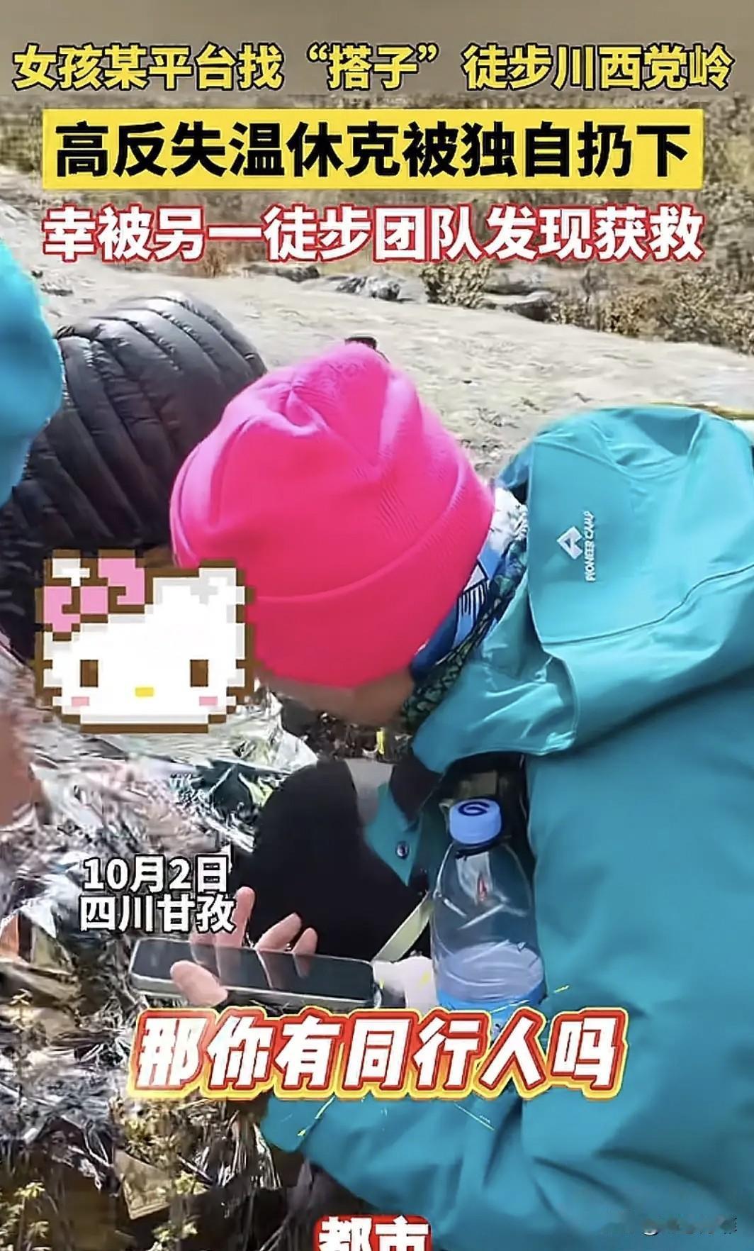 一女子在网上找了旅游搭子去川西徒步,在4700多米的山上因高原反应昏迷失温,旅游搭子却不见踪影,幸被另一徒步团队发现获救。救援人员:女子已无大碍。 四川,丹巴县的党岭山上,海拔4700多米,又高又冷,女子和网上平台约的旅游搭子一起去的,互相不怎么熟,临时组成的同伴。 到了垭口附近,女子因为高原反应突然晕过去了,还开始失温,但跟她一起的搭子,直接不见了踪影,没人管她。 幸好,一支路过的徒步队伍发现了她,马上给她铺隔热垫,盖衣服,先稳住她的状态。 之后救援人员赶来,这时候女子已经意识模糊。 下山的路特别难走,全是石头,前一晚还下过雨,路又滑,救援人员就轮流背着她往山下走,直到把她送上救护车。 一起出来玩,同伴都昏迷快不行了,搭子却不见踪影,这种行为既没良心,也不负责,完全没把结伴的情分和别人的生命当回事。 另一队徒步人员,二话不说就放弃自己的行程去救人,他们的无私奉献值得点赞,也佩服他们的善良和勇气,这就是真正的人间大爱。