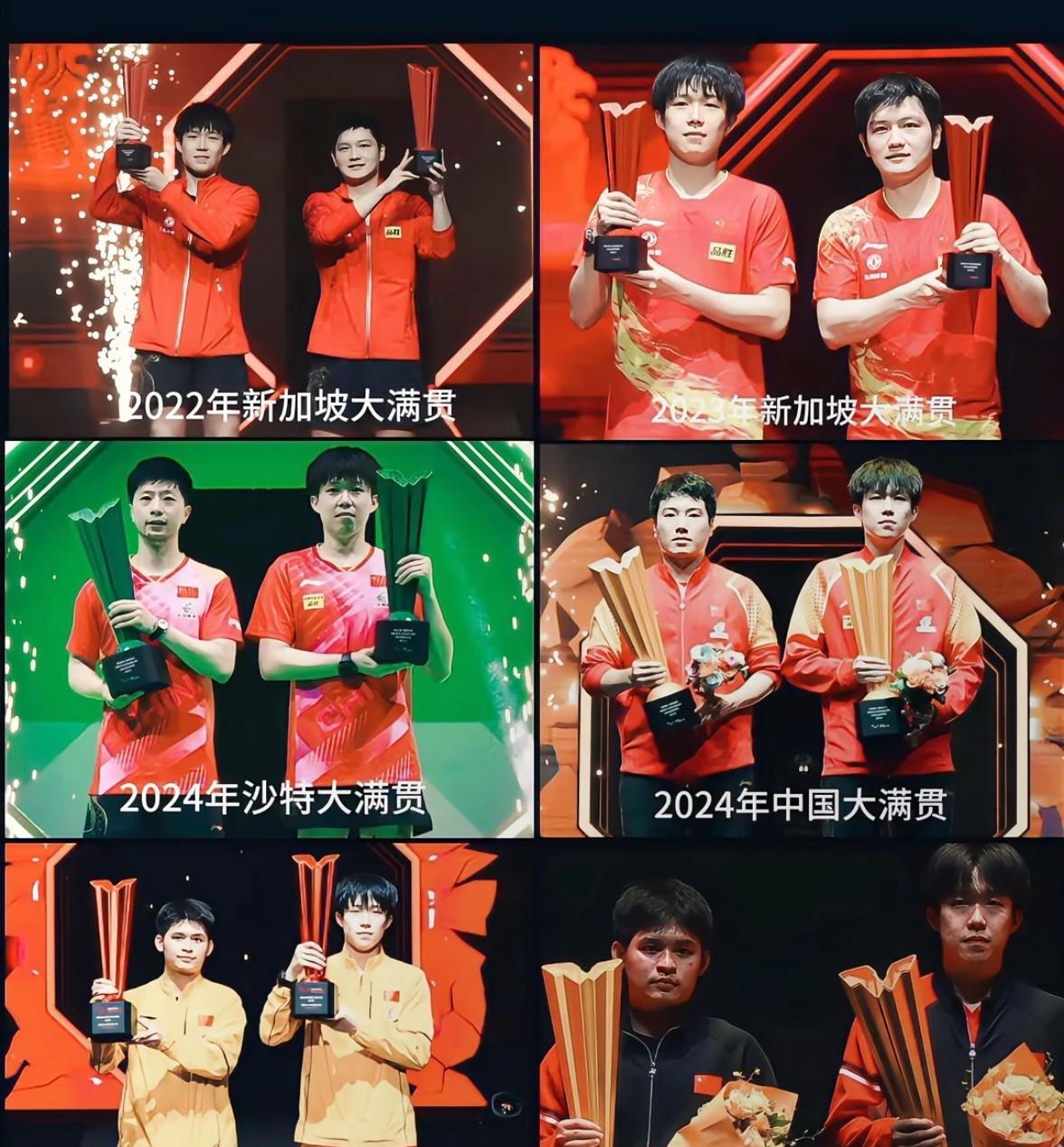 东哥一个,我一个。 龙哥一个,我一个。 大胖一个,我一个。 石头一个,我一个。 混双也是这样。如果去年中国大满贯参加,估计也是6个了。 单打强,双打意识强,协作能力强,又有担当,都想和他配,和谁都能拿冠军! 搭档一直在变,唯一不变的是王楚钦!骄傲真的骄傲,王楚钦,双打的王!