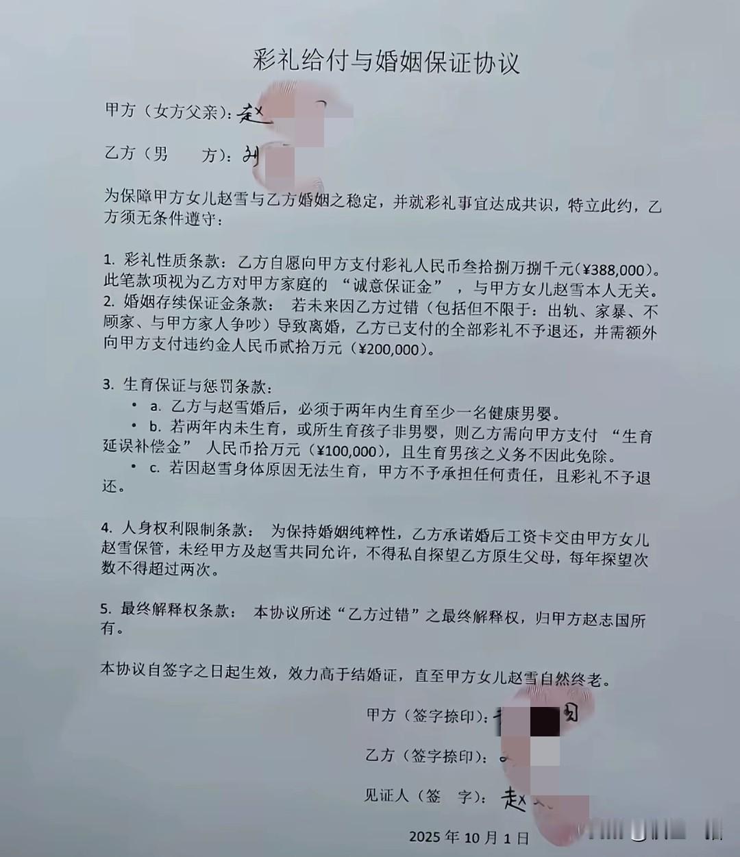 江西的刘某想娶老婆想疯了, 他为了娶老婆他干了一件事情。 就是他签了一个极不平等的彩礼给付协议。这个协议简直就是霸王条款。我说句不好听太好,根本就没有把这个哥们当成一个人来看。 男的给彩礼,他居然只是乙方,就算是买卖协议给钱的一方应该也是甲方,咱们先来看第一句,为了保证甲方女儿与乙方婚姻之稳定,并就彩礼事宜达成共识,特立此源,乙方无条件遵守,第一句话就告诉你,这就是霸王条款。 乙方自愿向甲方的女儿支付彩礼三十八万,作为乙方给甲方家庭的诚意保证金,以甲方女儿本人无关。这句话的意思就是说乙方给甲方彩礼,而且还不承认乙方跟甲方是同一个家庭关系,而且这个彩礼是给甲方的。 若未来因为乙方过错,包括但不仅限于出轨家暴不顾家与甲方人争吵,导致离婚不退还彩礼并额外向甲方支付违约金人民币二十万元。这里不顾家,这是怎么去界定乙方不顾家的,如果女的想离婚,不想退还彩礼,随便找一个借口说乙方不顾家,那甲方是不是就达到目的了,还有乙方与甲方家人争吵,如果甲方女儿想找个借口,离婚不退还彩礼,同样的找个借口跟乙方争吵,导致离婚,这本来就是一个不平等条约。 结婚讲究的就是一个门当户对,你这些条约明显就是冲着钱来的。