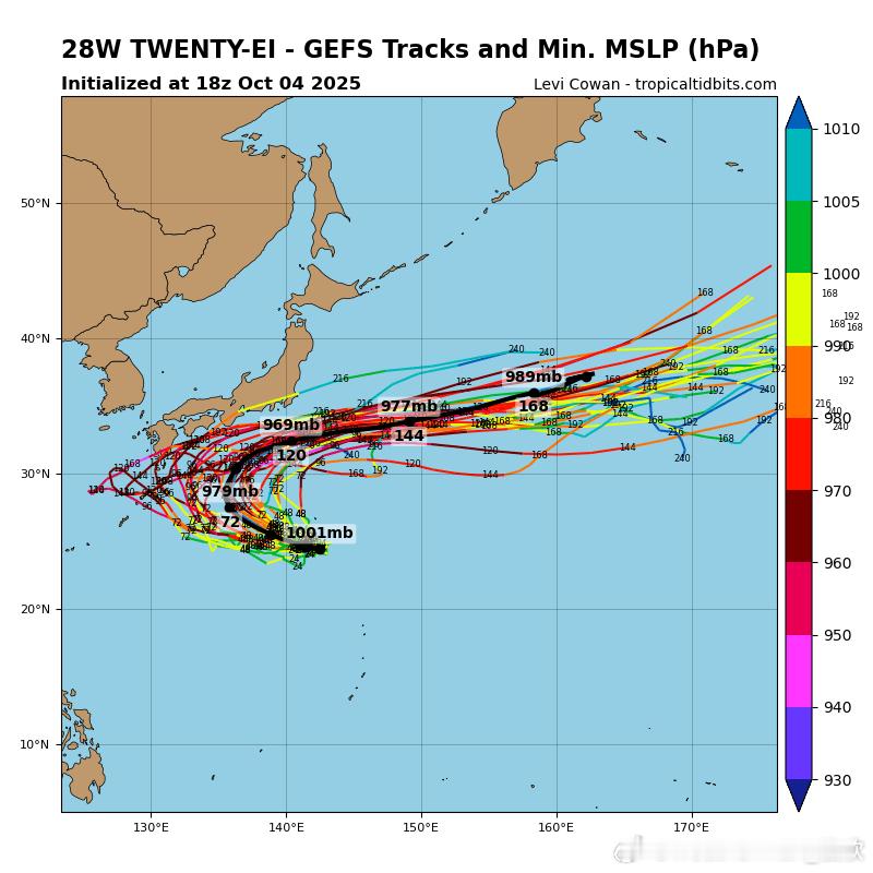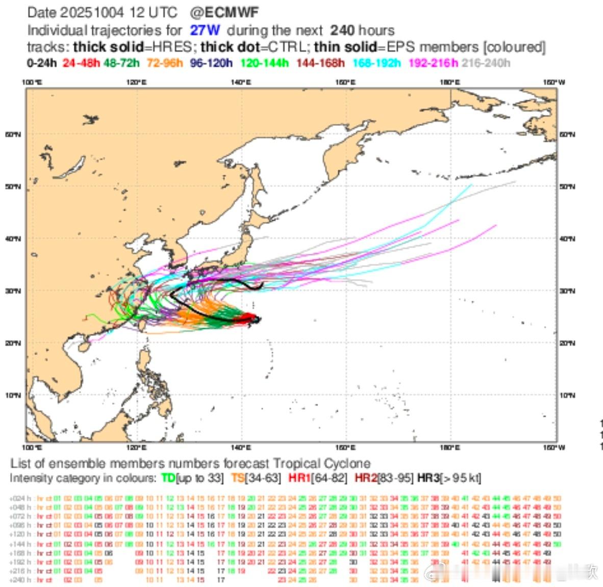 未来路径存在很大不确定性,大概率是抛物线转向路径,但转向点位置,分歧巨大。美国集合预报认为没有进入东海前就转向了,不影响我国。欧洲集合预报,转向点偏西,部分成员给出登陆我国华东后转向。未来继续观察。