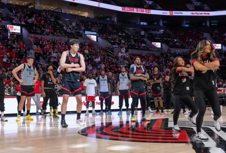 融入得真好[点赞]!杨瀚森背上粉色书包跟拉拉队一起欢快跳舞,感觉小杨还挺享受的啊哈哈,队友们都被逗笑了