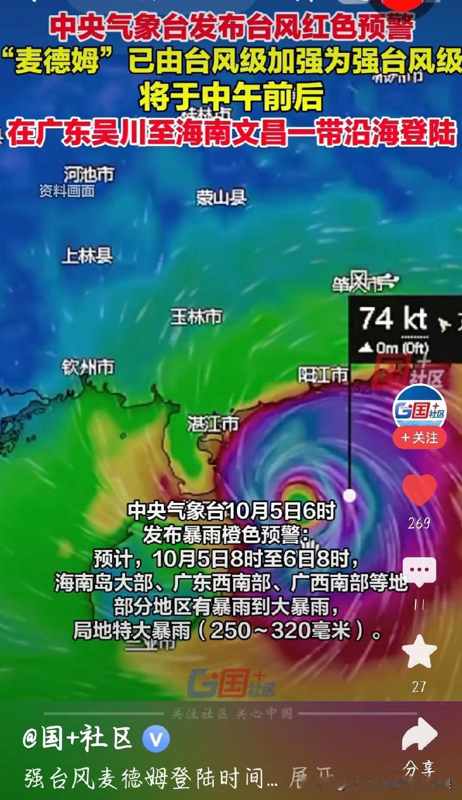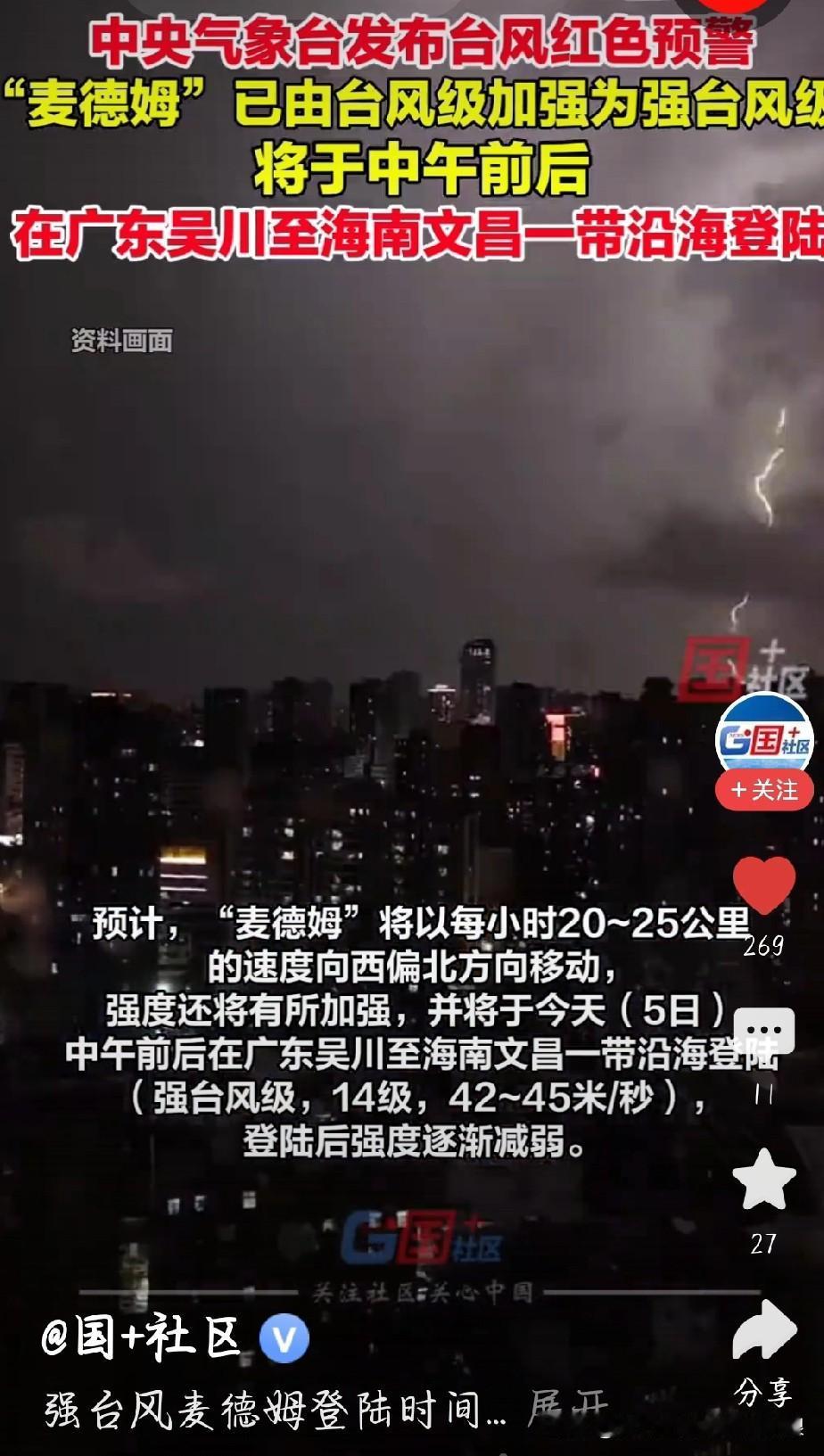 注意了!强台风“麦德姆”正往广东、海南这边扑,今天中午前后就要在电白到琼海一带登陆,风力能到14-15级,阵风更是能掀翻东西。 现在中央气象台都挂了红色预警,这是最高级别的提醒。海口已经全面“六停”,航班也全取消了,珠海的景区、浴场全关了。接下来这一带会下大暴雨,海南、广西局部可能下特大暴雨,还得防山体滑坡这些危险。 别不当回事!14级风能把树连根拔起,暴雨也能淹了低洼地。这会儿就别出门瞎逛了,赶紧检查门窗,把阳台花盆收进来。安全第一,等这阵风雨过去再说!台风“麦德姆”今日中午前后登陆 台风麦得姆 直击强台风“麦德姆” 面对台风“麦德姆”海口市民需做哪些准备 图片截图于网络