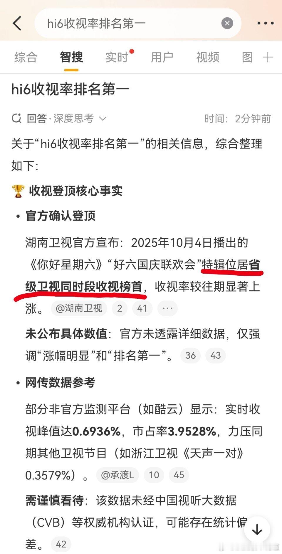 hi6收视率排名第一湖南卫视现在真是不行了,居然搞这种挂羊头卖狗肉的词条吹牛,点进去我以为是好六播出以来的新史冠诞生了,结果只是省级卫视同时段第一,甚至不是和往期比,无语到了。