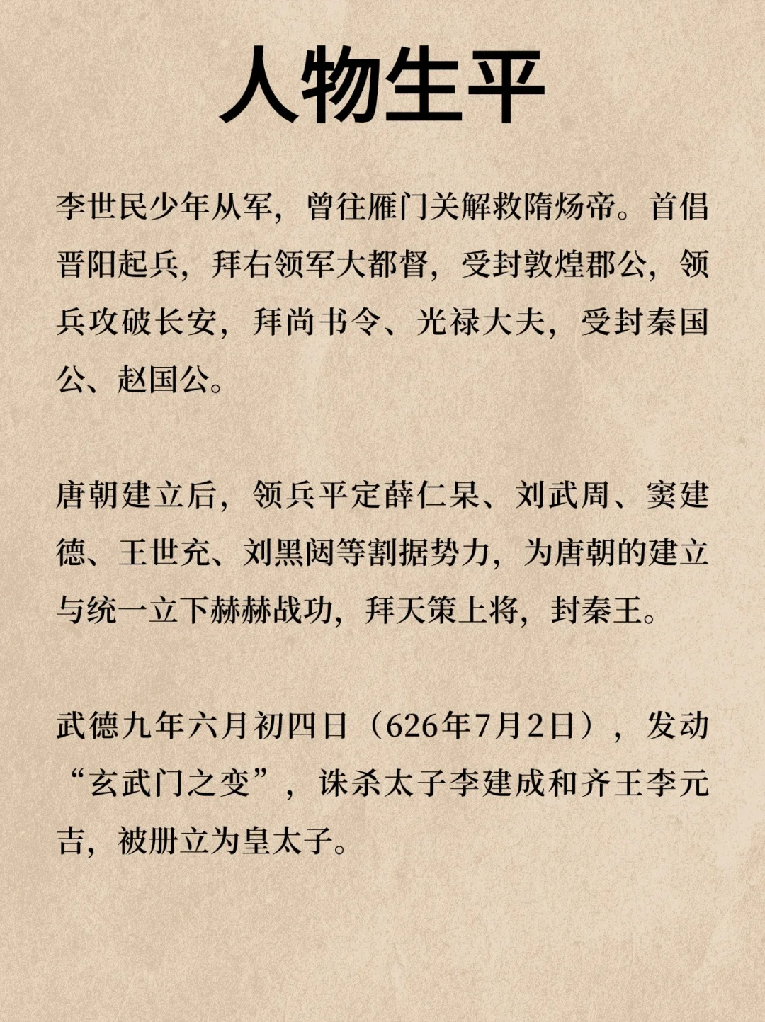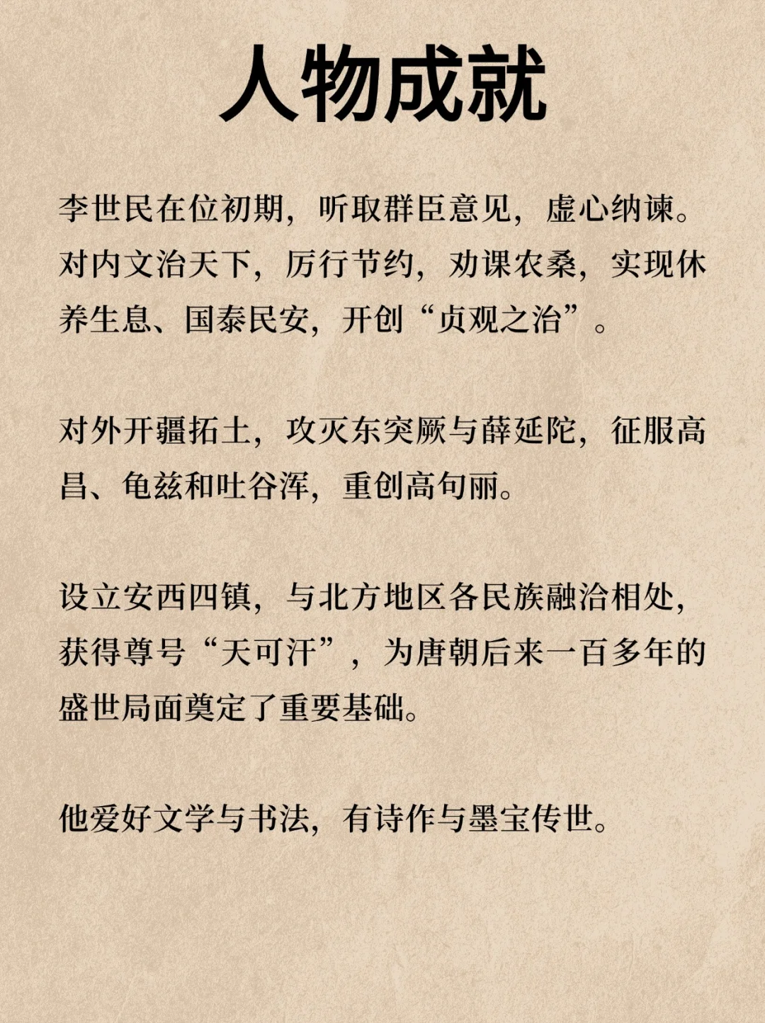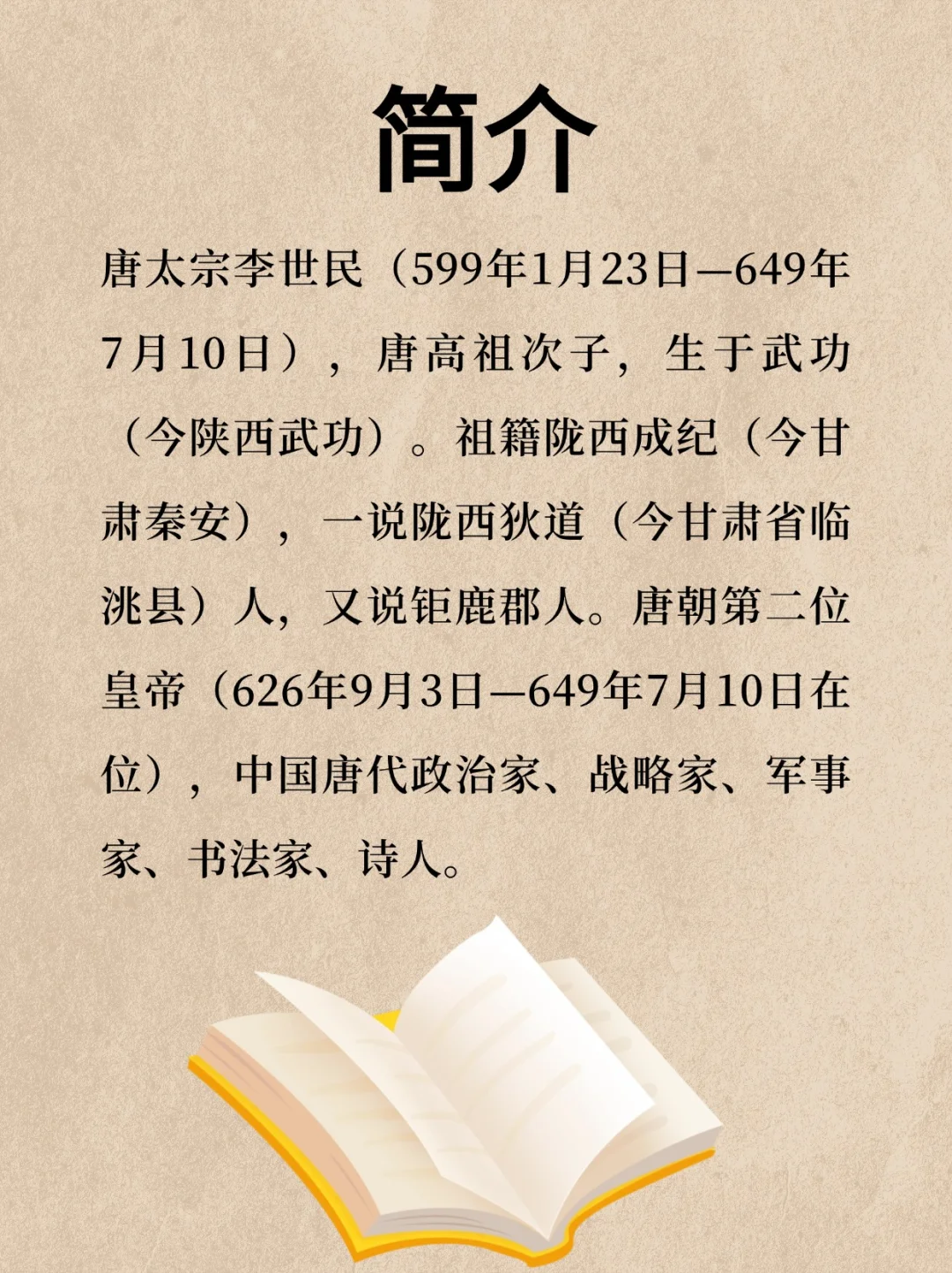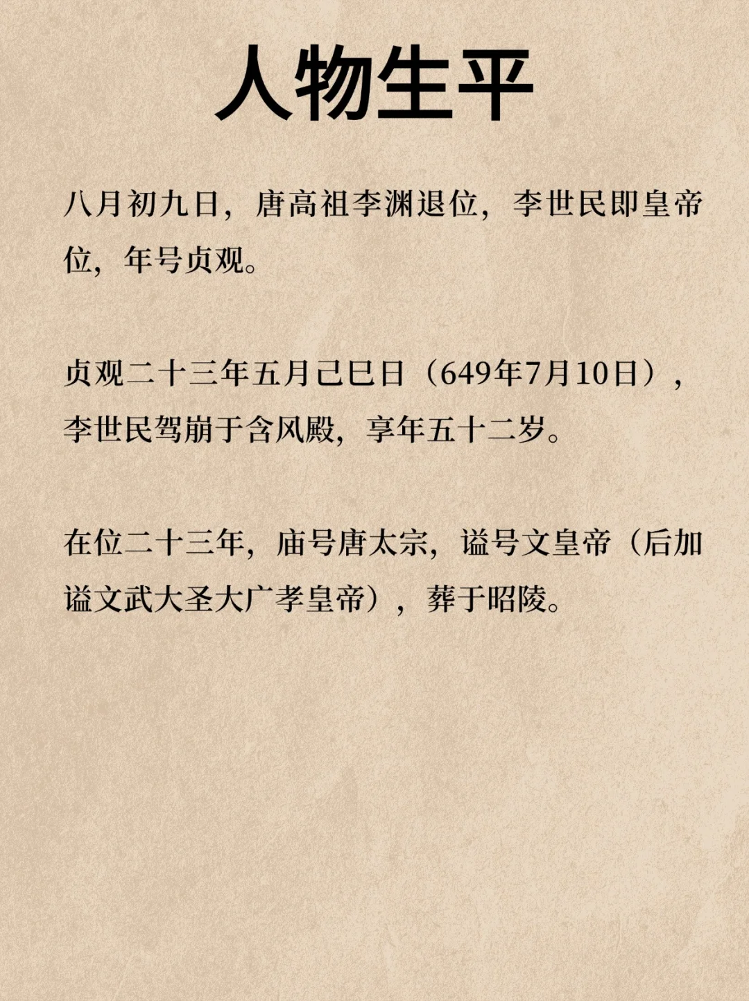 [种草R]唐太宗李世民(599年1月23日——649年7月10日),唐高祖次子,生于武功(今陕西武功)。祖籍陇西成纪(今甘肃秦安)。 [星R]一说陇西狄道(今甘肃省临洮县)人,又说钜鹿郡人。唐朝第二位皇帝(626年9月3日——649年7月10日在位)。 [樱花R]中国唐代政治家、战略家、军事家、书法家、诗人。 [私信R]八月初九日,唐高祖李渊退位,李世民即皇帝位,年号贞观。 贞观二十三年五月己巳日(649年7月10日),李世民驾崩于含风殿,享年五十二岁。 -