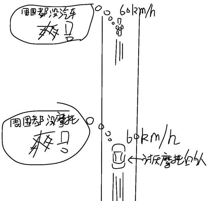 大家希望放开摩托禁令吗? ------------------------------------ 我这个人不反对别人表达自己的观点,但是我极致嘲笑双标。 比如,上图这种情况,你怎么做? A.在①处等待 B.在①处按喇叭让摩托车让开 C.直接通过②处右转 A是正解 选项B,直行加右转车道,没有直行车非得让你右转车先走的道理。不用抬杠,交警对该情况执法的视频一搜就有。你可以说你尽量不在最右侧车道等红灯,我认同毕竟我也这么干,但是根据法规“摩托车只能行驶在最右侧车道”,摩托没得选。 选项C,“同一车道不能并排走两辆车”,谁说的我不知道,总之这种行为叫做“钻缝”。至于你有几个轮子,无所谓的,你就算五对负重轮它也是钻缝——不过这话也不是我说的,纯借用。 那么对于选项A,是不是就没问题了呢? 还真不是。 如果等红灯的不止一台摩托车,并且大家都遵纪守法,不能钻缝,就会变成这样: 好像离线有点远?没办法,守法的嘛。 但是,有一说一,这会降低路口的通行效率,对路况造成压力。 有没有办法呢?有的,如图所示: 好耶!一下离线近了很多!唉,你说不行?什么?违法了? 哦对,钻缝了。 当然,高素质如您,会守法的排在一排摩托车后面,对吧? 言行一致,不双标的人都是可敬的。 当然,至于宁可双输加造堵也看不惯摩托车先走一步什么的,不在本回答讨论范围内哦。 ——引申阅读—— 注意:不建议阅读理解不过关的人阅读这部分内容。 OK,大家都明白,大型城市交通压力有多大。如果稍微不那么“合法合规”一点,其实是可以有效降低交通压力的。 如图所示,完全合规的话,你是这样排队等待。 现在我们稍微不合规一点,让摩托车钻缝钻到前面去,后轮贴着停止线停。 怎么样,是不是好多了? 你说有些人就是讨厌摩托车?那更应该这样了。 众所周知,摩托车起步就会飞快提速。 在这种情况下,就会变成这样。 然后就会变成这样: 你看,双赢了。 不是很理解既讨厌摩托车,又非得和摩托车挤在一起谁也走不动的人。 抖M?还是宁可双输啊?