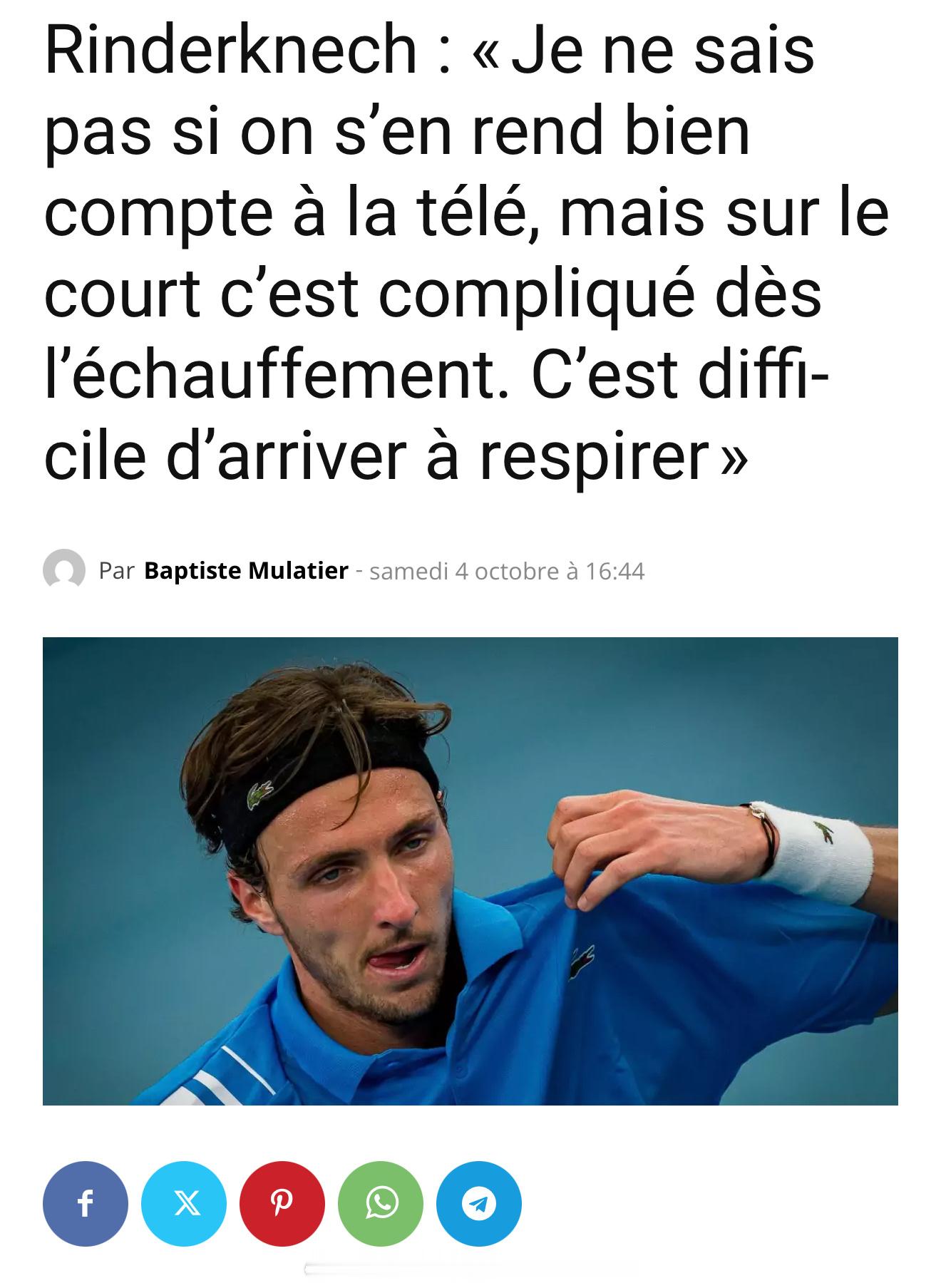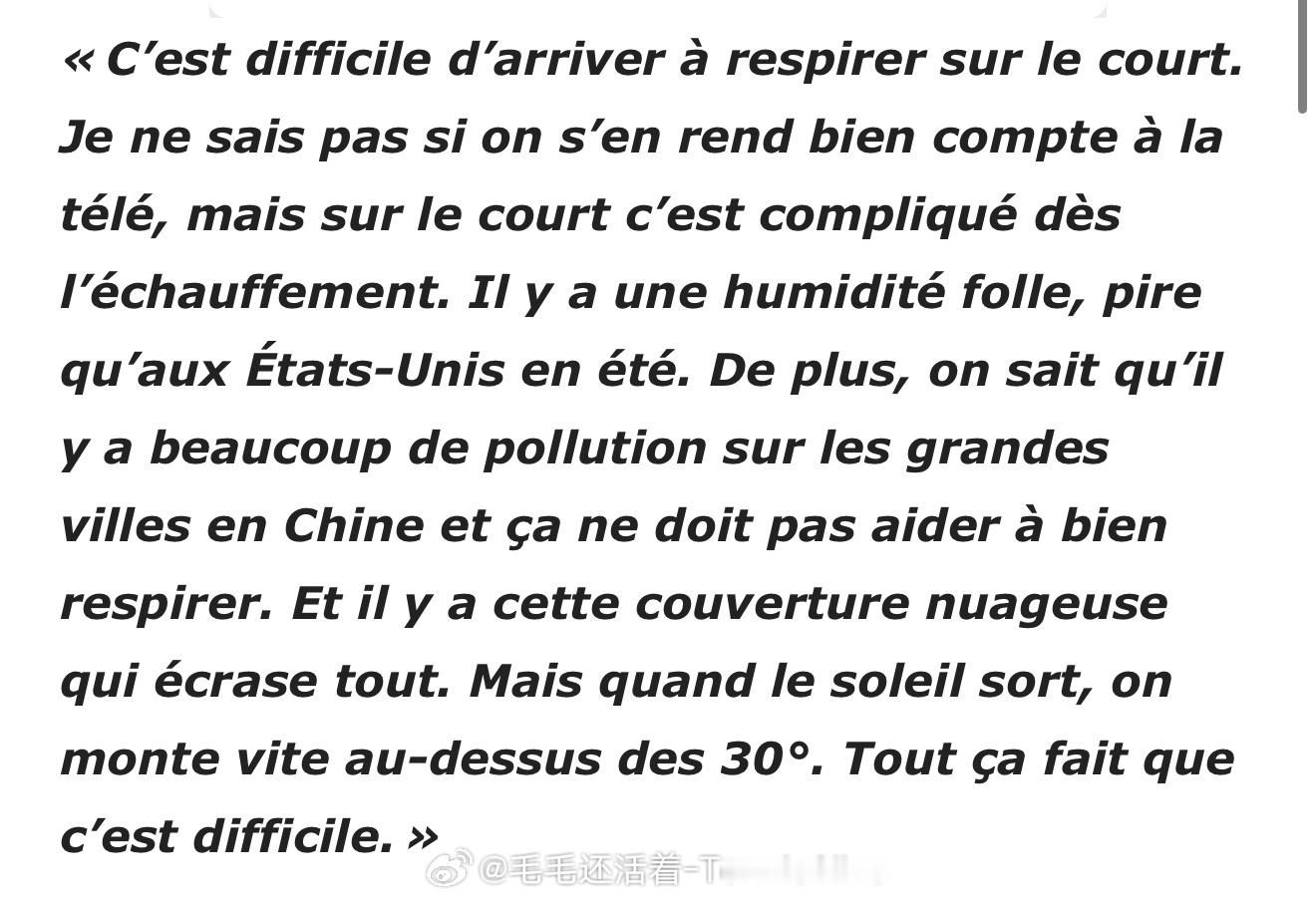 “在球场上很难呼吸。我不知道你是否能在电视上看到这一点。但在球场上,一旦天气变暖,事情就变得复杂了。这里的湿度非常高,比美国夏天还要糟糕。此外,我们知道中国的大城市有很多污染,这对呼吸没有帮助。有一片乌云笼罩着一切。但当太阳出来的时候,你很快就会上升到30度以上。所有这些都让事情变得困难。”