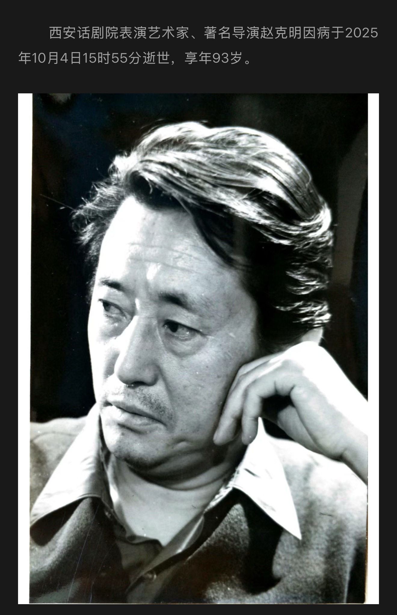 西安话剧院表演艺术家、著名导演赵克明因病逝世,享年93岁。