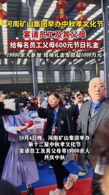河南一企业中秋豪掷千万!宴请1.9万员工父母还发礼金,这波操作太暖心 10月4日晚,河南矿山集团的中秋孝文化节现场格外热闹——19000余名员工及其父母齐聚一堂,共享盛宴。 更让人暖心的是,企业创始人携高管为每位员工父母送上鲜花,还发放600元节日礼金,现场发放总额超1000万元。现场上千圆桌座无虚席,月饼、酒水摆满桌,入口处的鲜花更是诚意满满。 这样的举动,不仅是对员工父母的感恩,更是把“孝”文化落到了实处,让员工和家人在中秋感受到了浓浓的暖意。