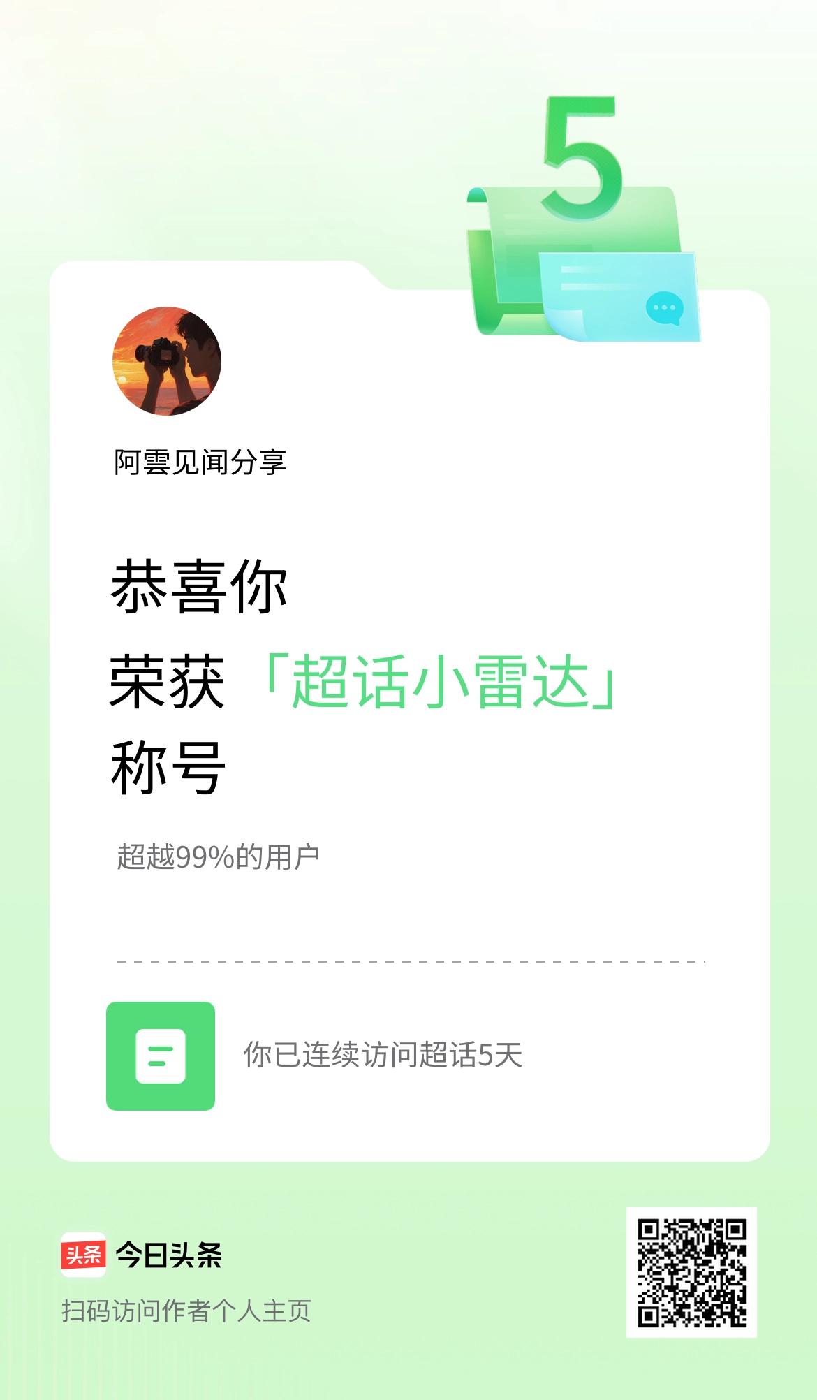 我在头条连续访问超话5天,获得“超话小雷达“称号,你也快来超话看看吧~
