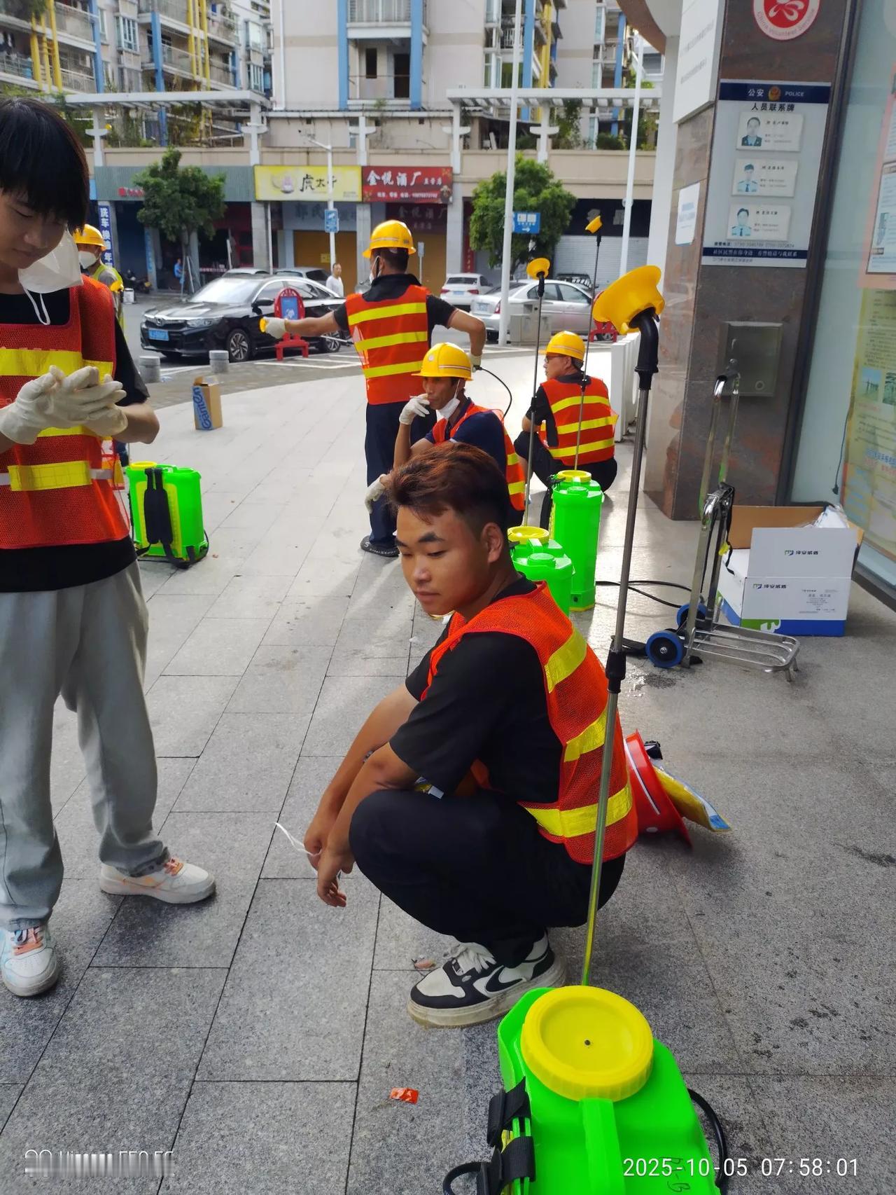 2025.10.05,今天继续去江门做日结,协助江门人民共同抗击基孔肯雅热疫情,今天早上6点多就从中山南头坐大巴前往江门,早上7.10多分就到达江门蓬江区,今天下车是在中远大厦附近,然后社区的工作人员已经等在那里了,清点了一下人数,然后一个工作人员要20人,跟她一起,走了大概一公里左右,到达江华社区,然后给我们安排工作,今天安排的是打药杀蚊子。我们20个人又分成10组,两个人一台喷雾器,穿戴好防护服,然后一个工作人员带领我们去一些小区,安排我们去指定的楼,这些楼一般都是七八层,我们背着装好药水的喷雾器,从顶楼逐层往下面,给楼道喷洒杀虫药,上午下了几次雨,两个人轮换,去给指定的楼喷洒药水。希望疫情早点过去。基肯孔雅热疫情 江门消杀 江门基孔雅热 江门封窗 江门健康管理 江门病历销毁 江门商务宴请
