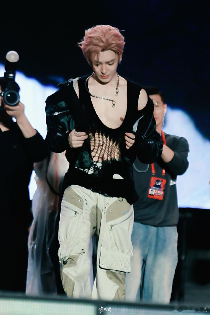 谁让侯明昊这个古人穿这些的 雀骨萧无衣的古典深V,大梦归离朱厌的潇洒,侯明昊古装已经够亮眼,谁想到现代音乐节竟有渔网衣+粉发的惊喜,这造型把他的优势全展现,必须说造型师太懂,配享太庙没话说