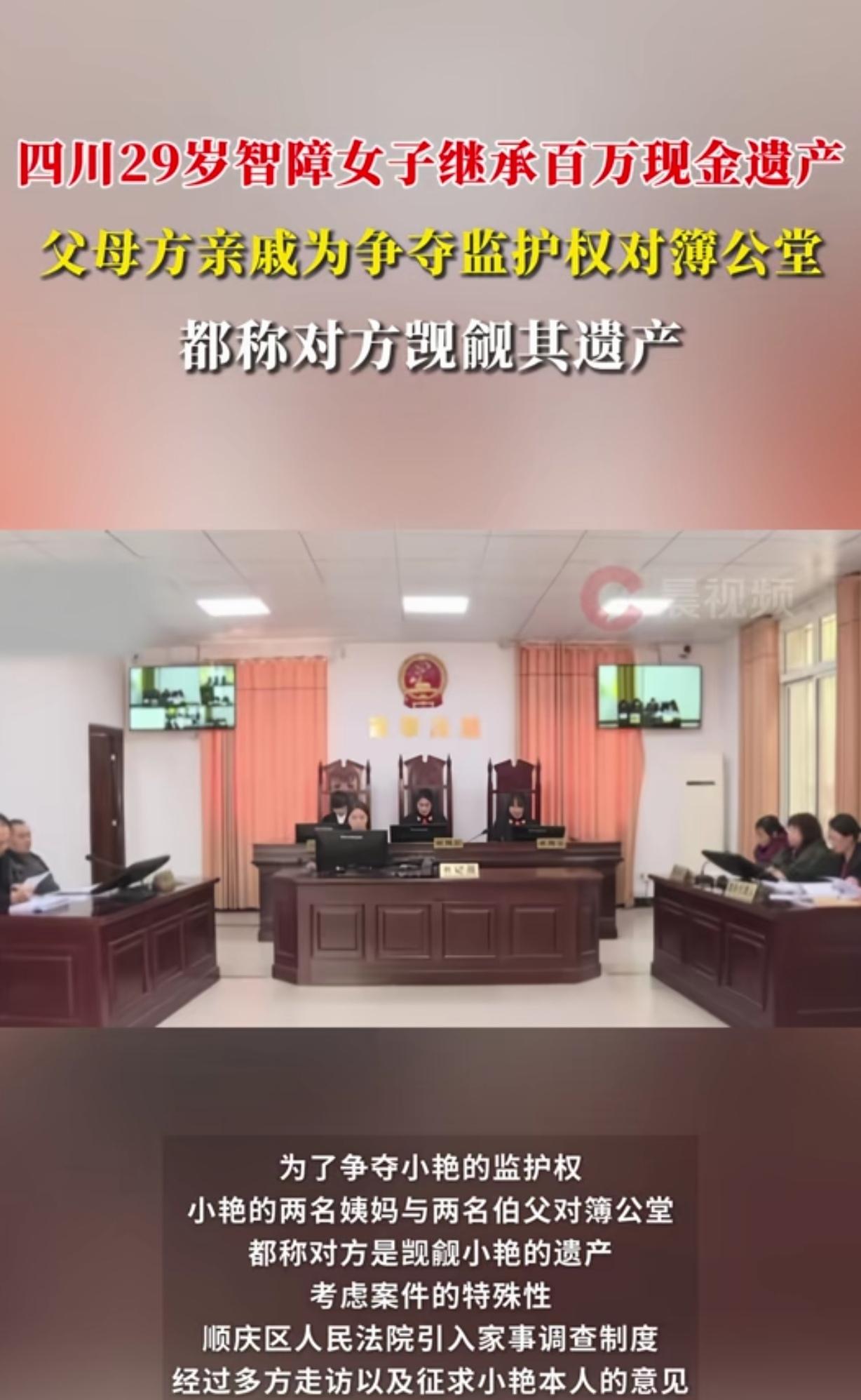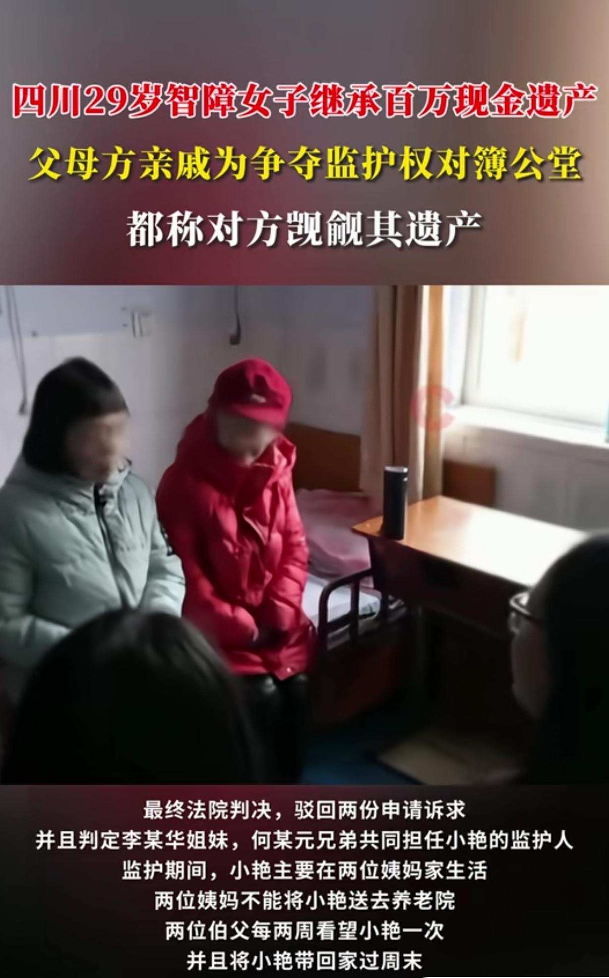 “都想吃绝 户!”四川南充,一29岁女子智力低下,她父亲工伤离世,赔偿了90多万,再加上继承外公外婆的20多万遗产,女子一下子有了百万身价,父母两边的亲戚都眼馋这笔钱,2个姨妈和2个伯父为了争女子的监护权打破了头,对簿公堂,法院判决大大出乎意料。 29岁的小艳重度智力发育迟缓,她和父亲相依为命,有父亲的庇护,小艳受不了苦,父亲老了,她虽然智力不行,但为父亲端个茶倒个水是没问题的。 可厄运专找苦命人,小艳的父亲在工地打工时,突然发生不测离世,还好,事故方赔偿了90多万,小艳有这笔钱也不至于生活无以为继。 再加上小艳从外公外婆那里继承的20多万遗产,这个可怜的女子,立马身价百万。 俗话说:财帛动人心!面对生活不能自理的小艳,谁都知道,只要取得了她的监护权,她的百万财富最后就收入囊中。 于是,小艳父母两边的亲戚蠢蠢欲动,躁动不安起来,她的2个姨妈,2个伯父,为了争小艳的监护权,大动干戈,吵得不可开交。 他们都想把小艳接到家里照顾,那就相当于接了个财神爷,到时候,她的钱也不会旁落他人了。 于是,平时见面客客气气,其乐融融的亲戚们,谁都不肯让步,最终导致撕破了脸,闹上了法庭。 两个姨妈在法庭上怒斥两个大伯,说他们见财起意,打着照顾小艳的名义,实则是觊觎小艳的百万财产。 两个大伯反唇相讥,说他们好心被当成驴肝肺,小艳是他们家族的人,姨妈就是外姓人,父母不在了,哪能轮得上外人接手,姨妈才是不安好心。 双方在法庭上吵得不可开交,剑拔弩张,法院认为这个案子很特殊,决定采取家事调查制度,走访了亲戚们,也争取了小艳的意见,最终做出了判决。 有些亲戚还不如外人,社区直接帮找个养老院,定期打款吧。 如果没有这百万遗产他们可能连看都不会看他一眼。可想而知他这些亲戚就算拿到监护权会对她好吗? 最好是街道或福利院接手,你看这些所谓的至亲个个如狼似虎的,把心都操的稀巴烂? 这就是人性,如果没有钱,父母不在了,没有一个人会管。 这些亲戚是想争到他的监护权,然后把她嫁出去,那样麻烦没有了,钱也到手,从古到今都是这样子做的,毕竟管不了家务事。 那么,法院会如何判决呢? 《民法典》第31条规定:对监护人的确定有争议的,由被监护人住所地的居民委员会、村民委员会或者民政部门指定监护人,有关当事人对指定不服的,可以向人民法院申请指定监护人;有关当事人也可以直接向人民法院申请指定监护人。 人民法院指定监护人时,应当尊重被监护人的真实意愿,按照最有利于被监护人的原则在依法具有监护资格的人中指定。 小艳的姨妈和伯父均申请担任监护人,属于监护权争议。法院按照《民法典》第31条的规定,启动家事调查程序,走访亲属并征求小艳意愿,即使其智力低下,法院仍会通过辅助方式了解其倾向,最终判定4名亲属共同担任监护人。 法院没单独支持姨妈或伯父的申请,而是指定双方共同监护,通过互相制约防止单方滥用监护权。 小艳主要在姨妈家生活,伯父定期探视,既保留了亲属照顾的亲情纽带,又避免监护权垄断。 指定多人共同管理财产并引入社区监管,确保小艳的百万遗产不被某一方私吞,符合“最大利益原则”。 《民法典》第35条规定:监护人应当按照最有利于被监护人的原则履行监护职责。监护人除为维护被监护人利益外,不得处分被监护人的财产。 未成年人的监护人履行监护职责,在作出与被监护人利益有关的决定时,应当根据被监护人的年龄和智力状况,尊重被监护人的真实意愿。 法院判决4名监护人共同设立银行账户并由社区监管,直接依据《民法典》第35条。 因小艳为智力障碍者,其财产处分需严格以“维护其利益”为前提。 如果单方管理财产,可能用于监护人的个人利益,如私自提取、投资风险项目,违反法律禁止性规定。 引入社区对财产使用进行监督,防止监护人联合侵吞财产,符合法律规定。 小艳在姨妈家生活,由双方分担日常照料责任;财产由4人共同管理,社区监督资金流向,如生活费、医疗费支出。 法院通过分割监护权,探视权、居住权、财产权,确保各方互相监督,避免怠于履行义务或过度干预。 法院判决以共同监护和第三方监管的方式,巧妙化解了亲属争夺财产的恶性竞争。 法律不仅在于分配权利义务,更在于通过制度设计引导人性趋善避恶。 最终,法院判决驳回2份申请诉求。并且判定2个姨妈,2个伯父共同担任小艳的监护人,监护期间,小艳主要在两位姨妈家生活,两位姨妈不能将小艳送去养老院,两位伯父每周看望小艳一次,并且将小艳带回家过周末。另外4人共同设立银行账户,对小艳的财产进行共同管理,并由社区监管。 对此,你怎么看? 关注@灋律盐究员 学法辩是非,用法止纷争。