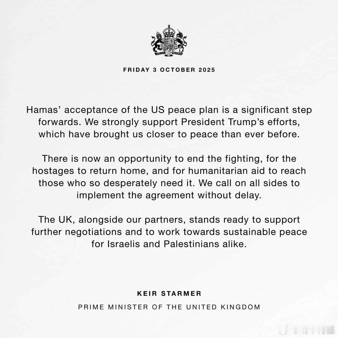 斯塔默表示哈马斯接受美国和平计划是向前迈出的重要一步,英国坚决支持特朗普,这些努力使“我们”比以往任何时候都更接近和平。英国与合作伙伴随时准备支持进一步的谈判,并为以色列人和巴勒斯坦人共同实现可持续的和平而努力。