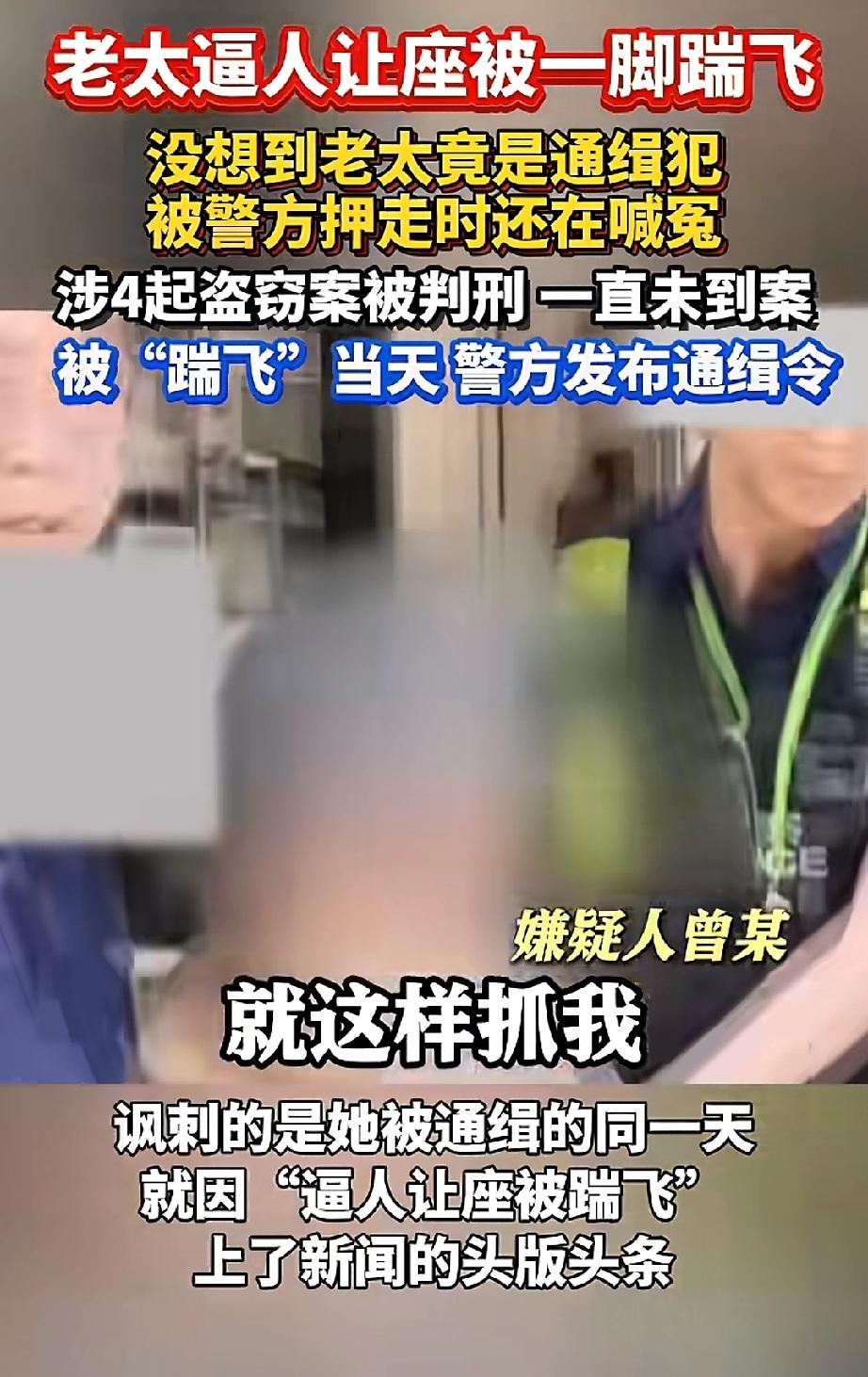 没想到一脚踢倒个通缉犯 一留着长发的男子坐车时被强烈要求让座,据说当时旁边也有座位,这一过分的要求随即引起女子的不满。于是这名男子给了这个老奶奶一脚,从视频中可以看到,这名老奶奶被踹在地上。当这名男子即将陷入道德指责时,没想到两级反转了,这名老奶奶在当天被通缉了。也就是说这名女子踹倒了一名通缉犯了,这下名声大噪了。 据了解,这名老人平时就在公开场合上倚老卖老,要求其他人让座、甚至对孕妇、心智不算的小孩动手抢座。同时,她还涉及4起盗窃案,此前就因为盗窃案被判刑55天,一直都是拒不到案。据说当时也是在一车厢内,这名老人无视周围的空座,强行要求一名留着长发的男子让座,遭到男子拒绝后就用背包击打男子的膝盖处。该名男子忍无可忍将其踹飞到对面空座上。次日,这名老人在超市因嫌弃超市收银员找零的速度慢而撒泼闹事,店员果断选择报警。警方核查身份信息时,发现这名老人是当天(车上的那天)被通缉的在逃人员。 目前这名老人已被警方依法逮捕,目前将面临至少50天的拘禁,需先执行此前未到案的盗窃案判决,后续还将因为寻衅滋事行为接受处罚。 在日常生活中,“让座”本是温情的自发善意,却被要求成强制要求。如果这名老人不是通缉犯,那这名男子估计要成为道德绑架的对象。这一脚,踹飞的是蛮横的道德绑架,踹出的是法网恢恢的正义闭环。这不禁让我们反思:在公共生活里,我们该如何守住自己的道德底线,又该如何敬畏法律的严肃性? 下跪拦车老人 女通缉犯 在公交车,该给老人让座吗 你会对抱孩子的宝妈让座吗 老人强行要求让座 你让还是不让
