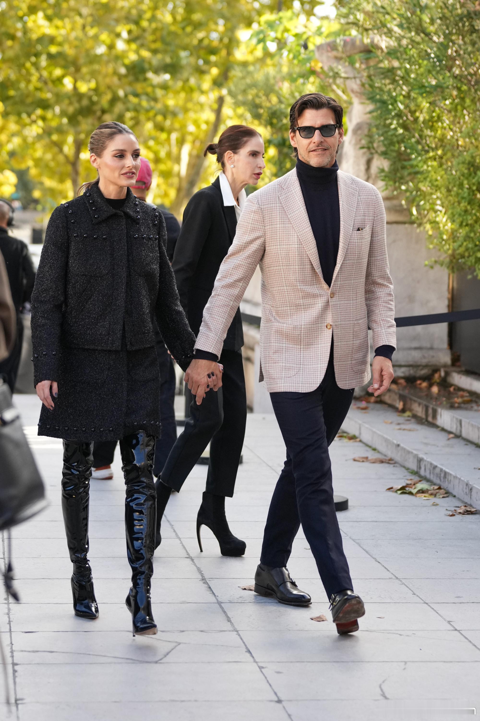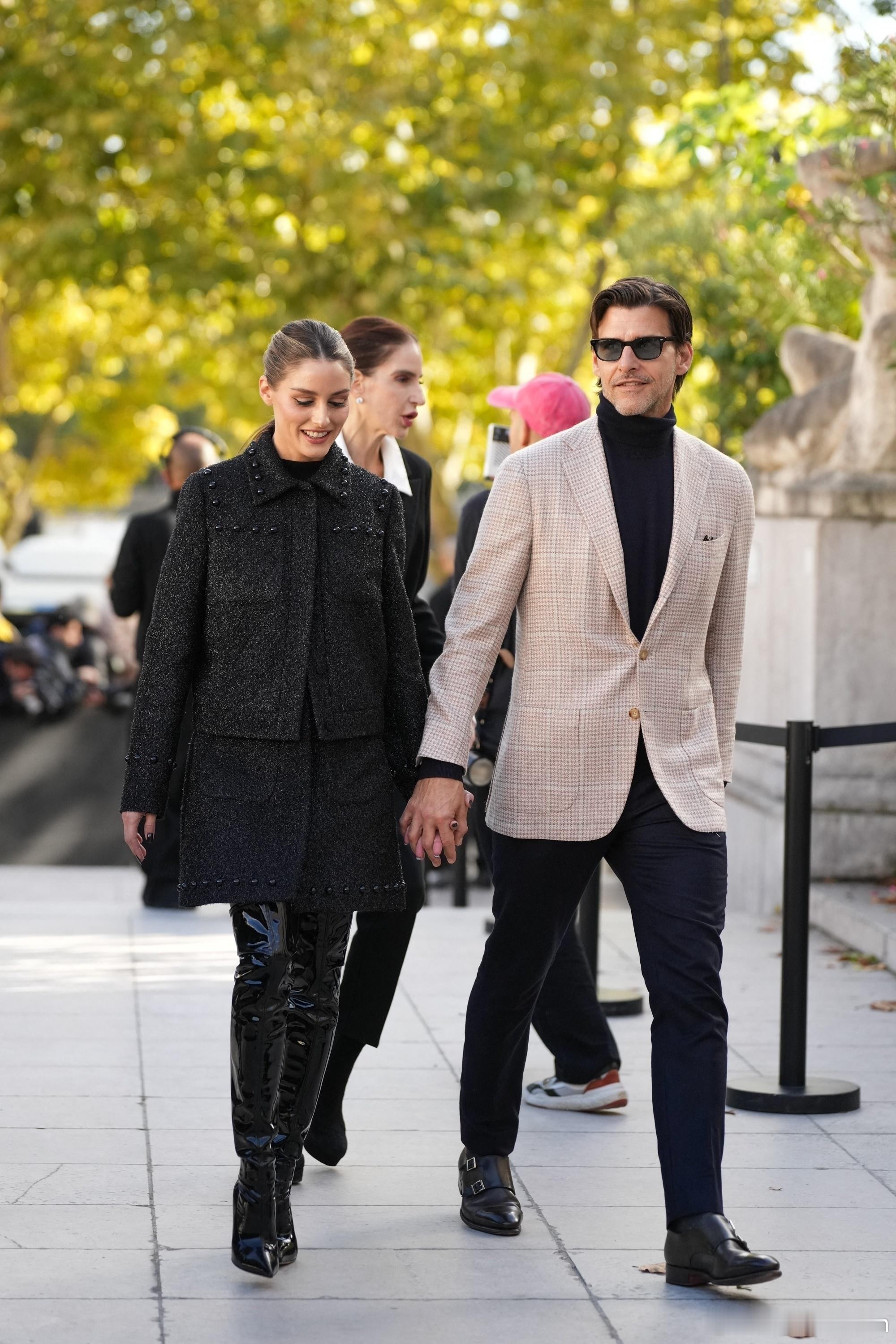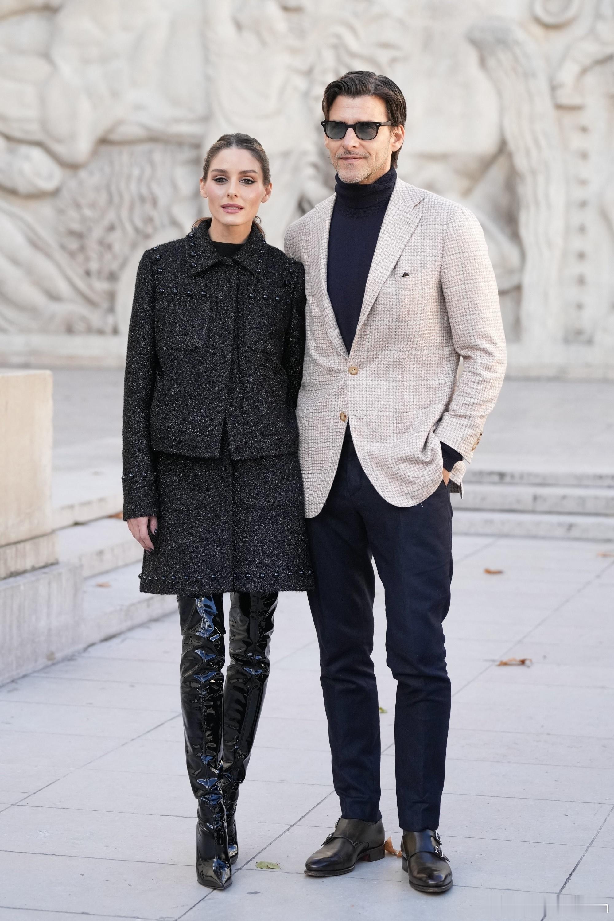 olivia palermo奥利维亚巴勒莫和老公Johannes Huebl约翰内斯徐贝尔在巴黎时装周期间出席观看Elie Saab品牌的大秀,巴勒莫小姐再一次穿上尖头过膝漆皮靴