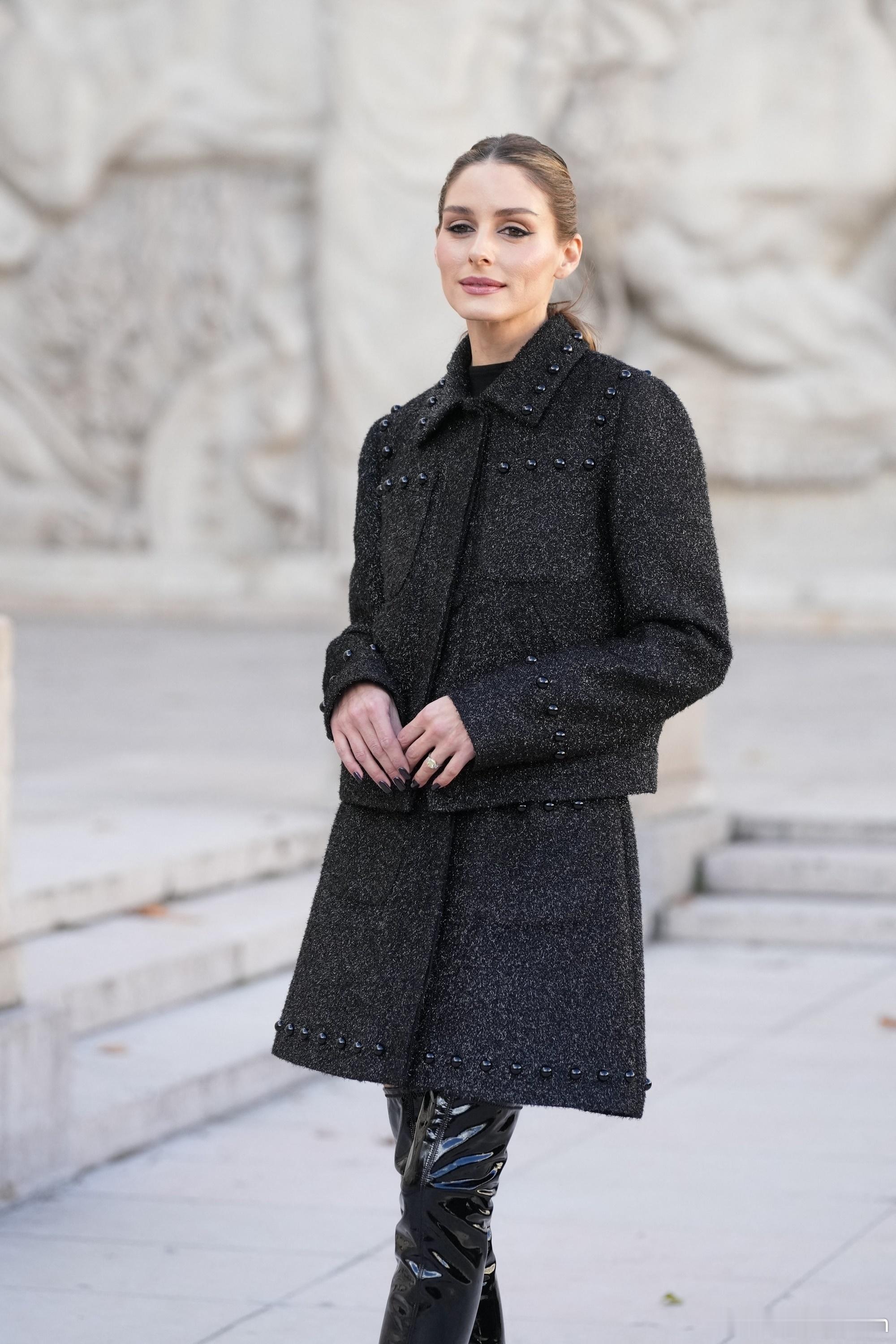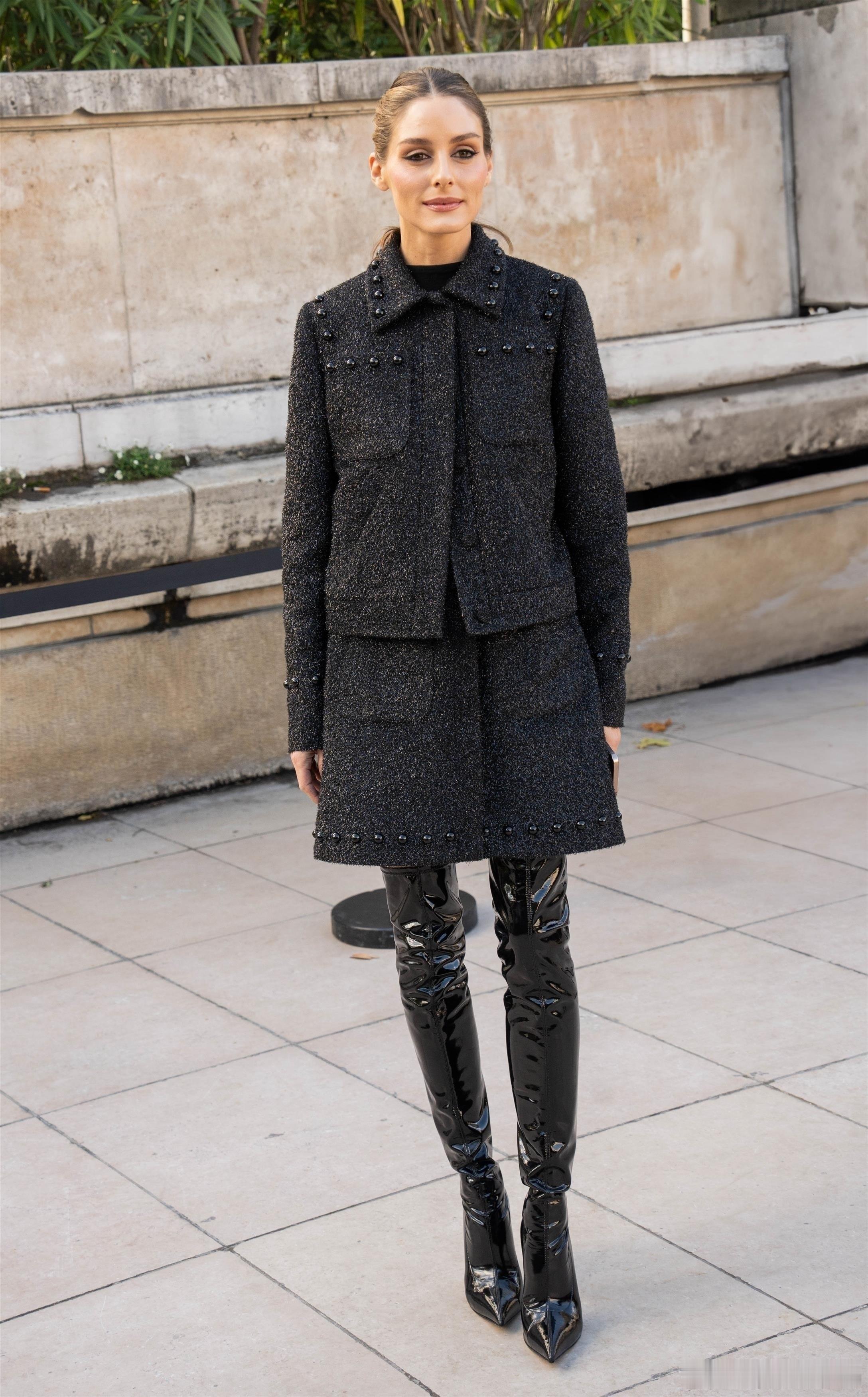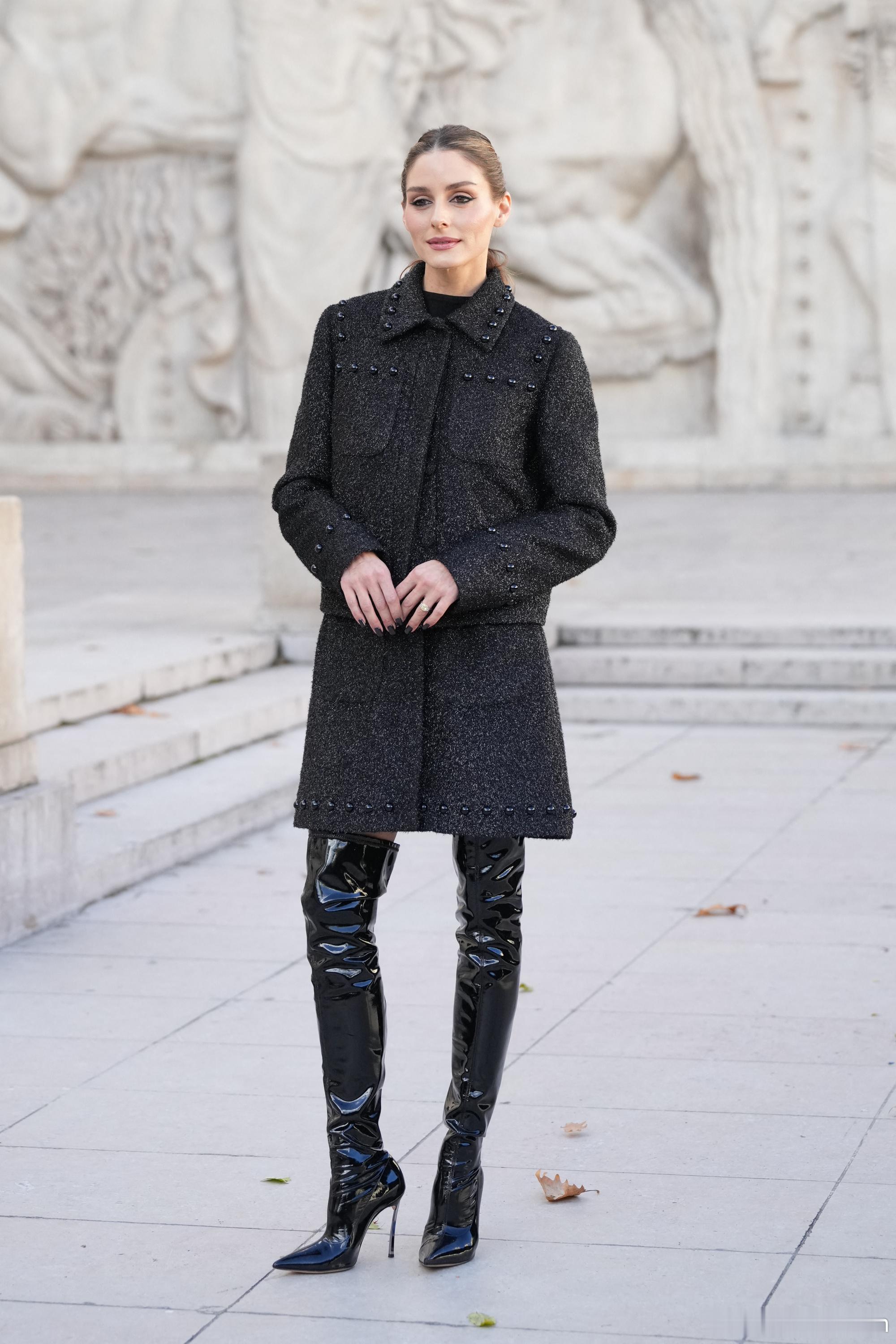 olivia palermo奥利维亚巴勒莫和老公Johannes Huebl约翰内斯徐贝尔在巴黎时装周期间出席观看Elie Saab品牌的大秀,巴勒莫小姐再一次穿上尖头过膝漆皮靴