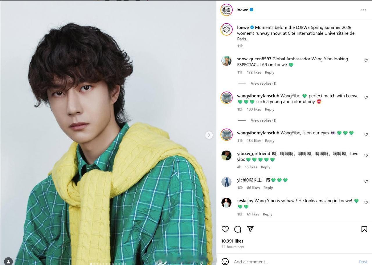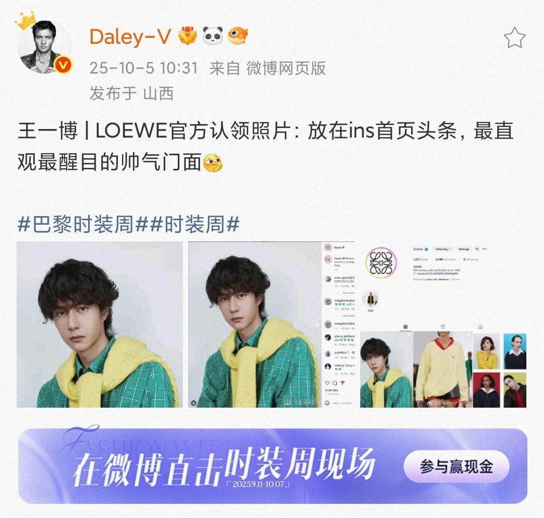 loewe ins首页头条——全球代言人王一博。单人首位,时尚博主直言:“最直观最醒目的帅气门面!” 而罗意威Facebook更新巴黎时装周相关,唯一亚洲、首个单人最大版面 仍然是王一博。 全能的国际巨星,排面就是这么“顶”[赞]。 王一博