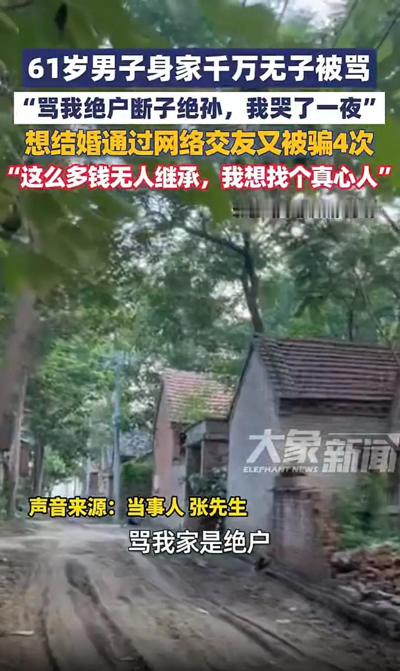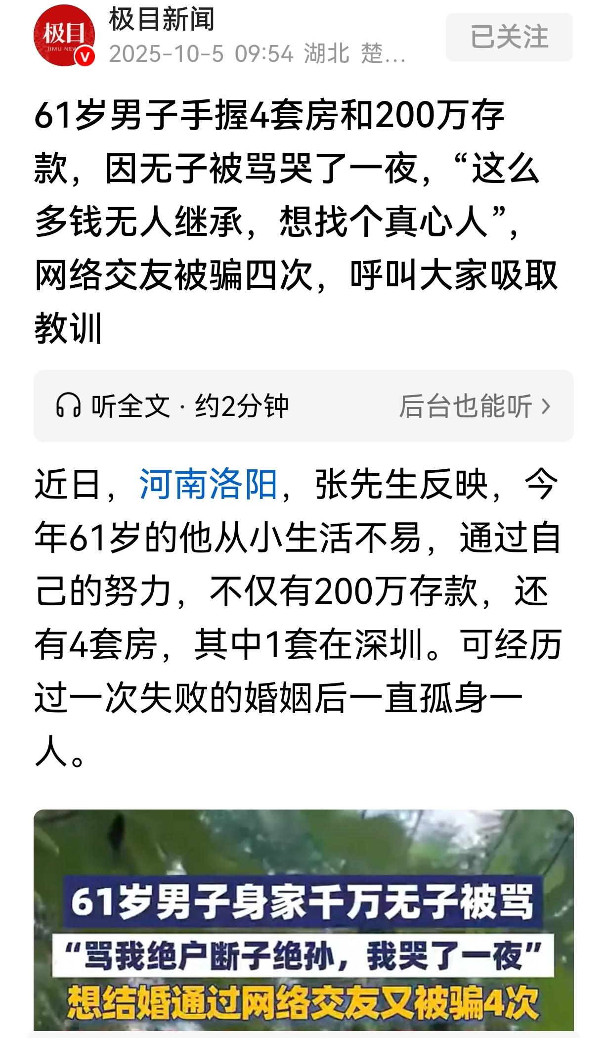 河南洛阳,一61岁大叔离异无孩,没有再婚,他打拼出4套房和200万存款,其中一套,还在寸土寸金的深圳,可没人羡慕尊重他,有人跑到他老家宅基地,破口大骂他绝户,大叔受伤了,痛哭流涕了一夜后,决定娶妻生子继承自己的财产,他去网上找对象,不可思议的一幕接连发生,他最终傻了眼。 张大爷六十有一,已经花甲之年了,他打拼一生,最终功成身退,不仅手里握着200万存款,每年的利息,吃喝都用不完,而且还有4套房,其中一套,在寸土寸金的深圳,他房租都收到手软。 可张大爷却每天愁眉不展,眼泪汪汪,有的人,人活着钱花的一干二净,有的人,人死了钱没花完,而张大爷,却愁的是自己千万家产无人继承。 原来,张大爷有过一次婚姻,但失败离婚了,也没生下一儿半女。 他离异后,可能没遇到合适的,也可能他被初婚伤透了心,他把所有精力,都用在事业上,挣得盆满钵满,最终花甲之年,却发现自己形单影只,孤身一人! 面对自己大半生的积累,却后继无人,张大叔黯然神伤,可他回到老家,本以为衣锦还乡了,没想到,大家并没有给予他基本的尊重,更没人羡慕他。 甚至,有人跑到他老家的宅基地,对他出言不逊破口大骂,说他是绝户,有再多的钱有啥用,连个传宗接代的人都没有。 这些话,对张大爷刺激不小,他决定立刻马上找个年轻的,能生养的,真心实意跟自己过日子的女人,然后舒枝散叶,生儿育女,也为时不晚,等他百年后,也有给自己顶门立户,披麻戴孝之人了。 于是,张大爷开始网络交友,寻找有缘之人,万万没想到,他接连认识4个女子,全被对方给骗了。 有的女子信息和实际大相径庭,照片长的跟仙女似的,一见面又老又丑,甚至客服得知张大叔是钻石王老五,都假扮女子跟他聊天想忽悠点钱,还有的女子本来目不识丁,竟谎称本科学历…… 张大叔被折腾的心灰意冷,精疲力竭,怎么想找个真心的女人就那么难呢?难道自己万贯家财,就后继无人了吗? 有人很疑惑,有四套房2百万的人肯定是做生意积累的财富,一个人对旅游肯定没啥兴趣,一个生活房租和利息都花不完,只有再找个合适的大龄女人再生两个孩子安渡晚年,76岁还找个26岁的呢,难道60还找不上一个40岁有生孕能力左右的阿姨吗? 能。但是这个女人能真心和他过日子很少!!很多都是榨干钱扭头就走。真爱是靠命的。 这种情况是没对家乡有贡献,而且人家知道他有几个钱,也没帮乡邻,所以人家恨他,修行吧,什么自己呀别人呀,有了平等心,就没这个分别执着了。 所以就算你有亿万,但你绝 后,人家一句绝 户。你都苦恼半辈子。他穷,子孙满堂,就算你骂他穷,但他很有底气怼你。但人家骂你断后,你就没有底气怼人家了。 当下都什么年代了,还死抱着陈腐观念不放?不必为世俗的偏见所苦恼,及时行乐。 自己把身体养好是关键,房子卖了,到处旅游,潇洒一辈子也不借,余生开开心心过,在死之前把钱花完就可以了。人生只是个体验,有无子嗣又有啥关系。 《民法典》第1127条规定:遗产按照下列顺序继承: 第一顺序:配偶、子女、父母; 第二顺序:兄弟姐妹、祖父母、外祖父母。 继承开始后,由第一顺序继承人继承,第二顺序继承人不继承;没有第一顺序继承人继承的,由第二顺序继承人继承。 张大爷无配偶、子女且父母可能已故,文中未提及,依据本条款,其遗产将无法由第一顺序继承人继承;若第二顺序继承人,如兄弟姐妹也不存在,最终遗产将收归国家或集体所有。 财产如果无法通过法定继承传承,则可能“后继无人”,这也是他急于寻找伴侣生子的核心动机。 如果张大爷再婚并生育子女,子女可作为第一顺序继承人;若无子女生育,则需通过遗嘱或遗赠抚养协议安排财产,如指定慈善机构继承,以避免财产被收归国有。 《民法典》第1065条规定:男女双方可以约定婚姻关系存续期间所得的财产以及婚前财产归各自所有、共同所有或者部分各自所有、部分共同所有。 张大爷在网络交友中遭遇欺诈,如虚报年龄、学历或身份,与其缺乏婚前财产约定直接相关。 如果他和潜在伴侣签订书面婚前财产协议,明确4套房及200万存款为个人财产,可有效防止对方通过婚姻牟取经济利益,如离婚时分割财产。 张大爷需通过公证、律师见证等方式固定财产归属,确保“婚前财产归个人所有”。 此操作可规避《民法典》第1062条“婚后继承或受赠财产默认共同所有”的风险,即使再婚后生育子女,也能保障自身财产权益不被配偶侵占。 张大爷被辱骂后继无人的行为已违反《河南省老年人保护条例》第3条,构成对其人格尊严的侵害。法律赋予其通过诉讼主张名誉权、要求赔礼道歉的权利。 如果张大爷最终再婚失败,老无所依,可以签订遗赠扶养协议,由扶养人,如可信亲属或机构负责晚年照料,以遗产作为回报。 对此,你怎么看? 关注@灋律盐究员 学法辩是非,用法止纷争。