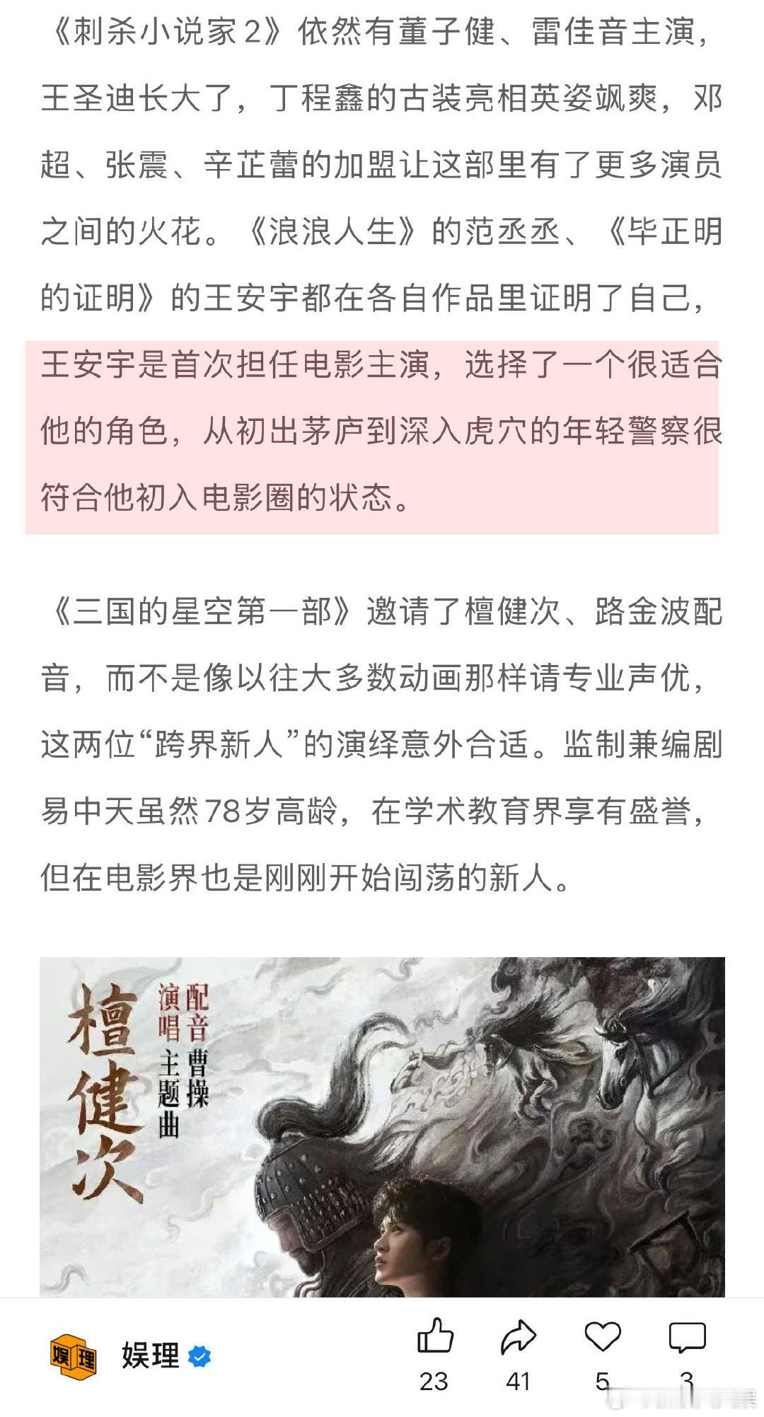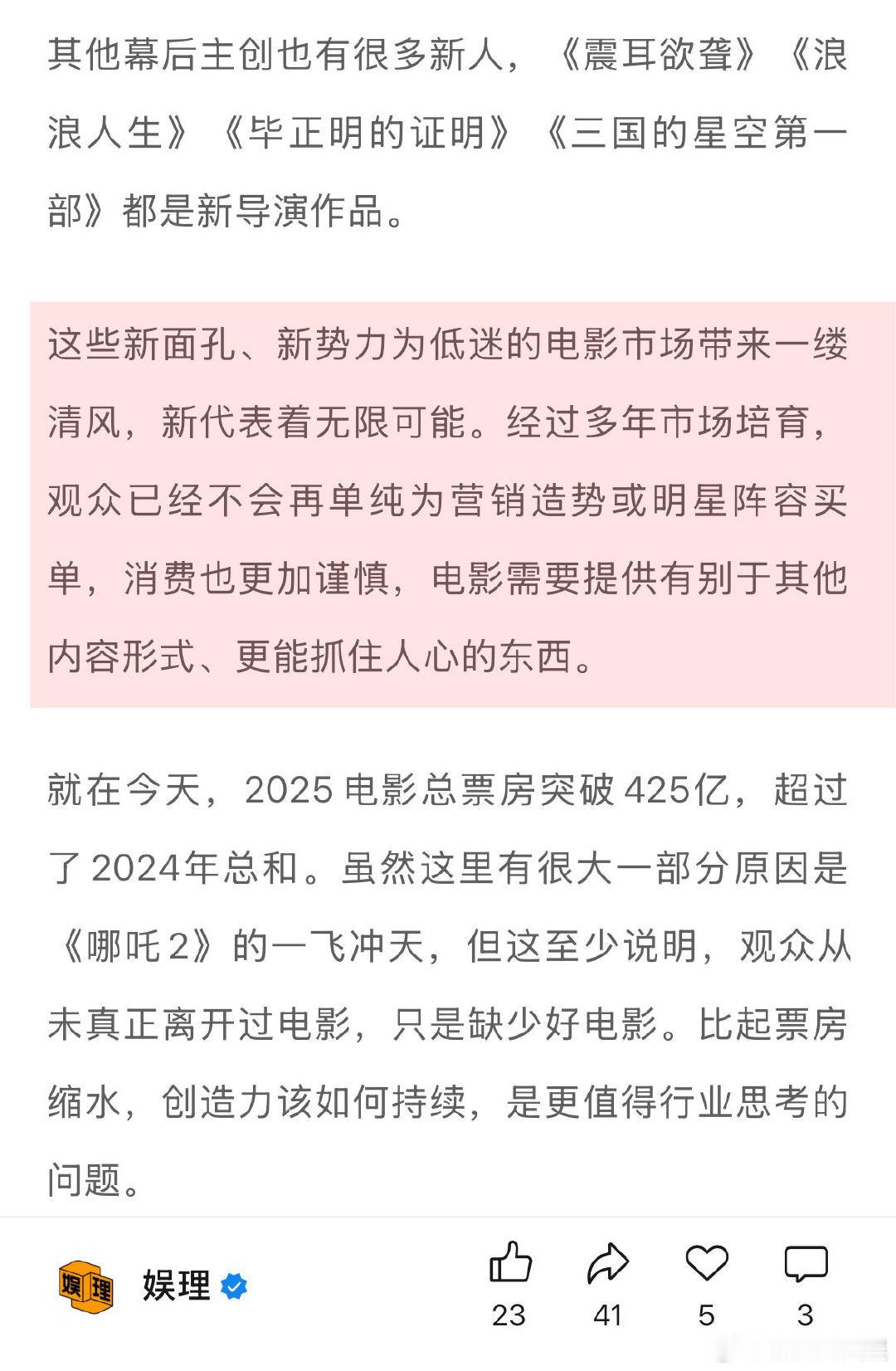 国庆档最大的新鲜感是新面孔 主旋律大片始终是国庆档的主流 除张子枫、檀健次、兰西雅、王安宇、范丞丞等年轻演员外,《震耳欲聋》《浪浪人生》《毕正明的证明》《三国的星空》都是新导演作品。经过多年市场培育,观众已经不会再单纯为营销造势或明星阵容买单,消费也更加谨慎,电影需要提供有别于其他内容形式、更能抓住人心的东西。娱理独家↓
