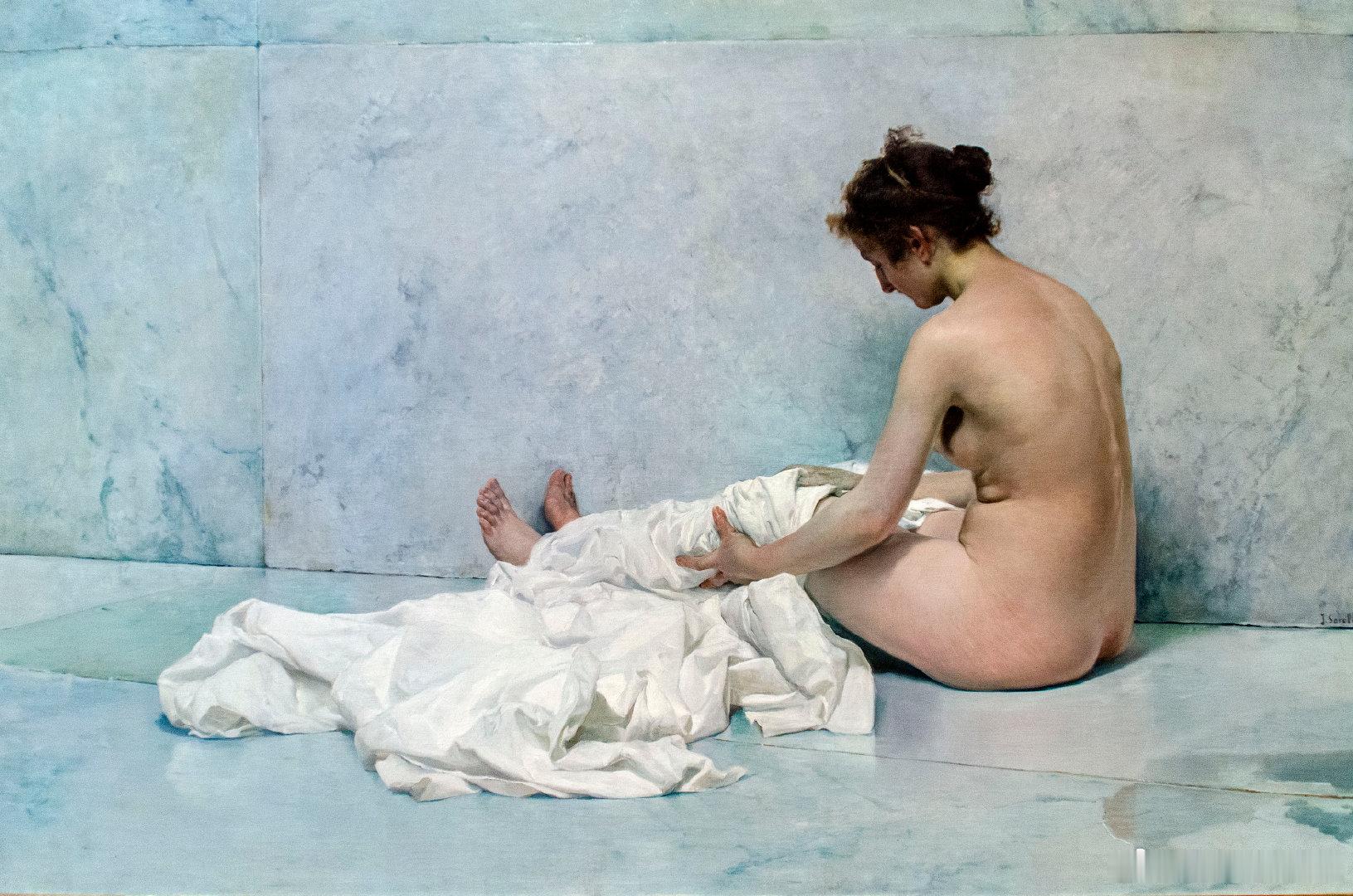 西洋历史文化鱼缸[超话] 西班牙画家华金·索罗拉(Joaquín Sorolla ,1863–1923)1892年的作品《沐浴后》。