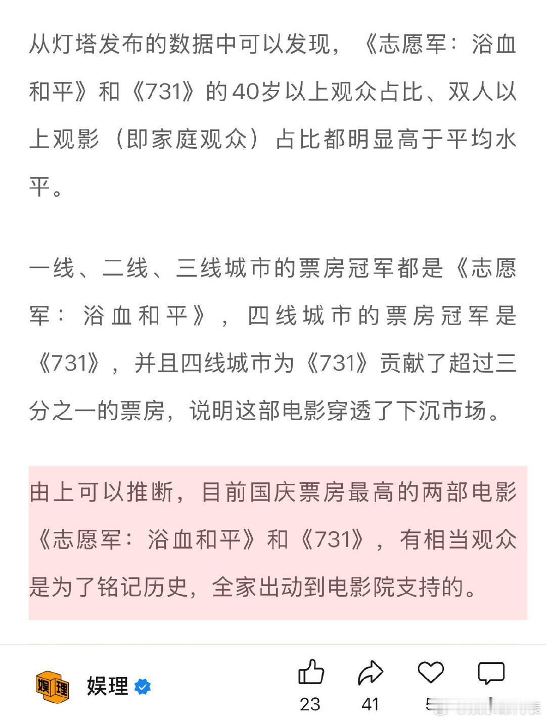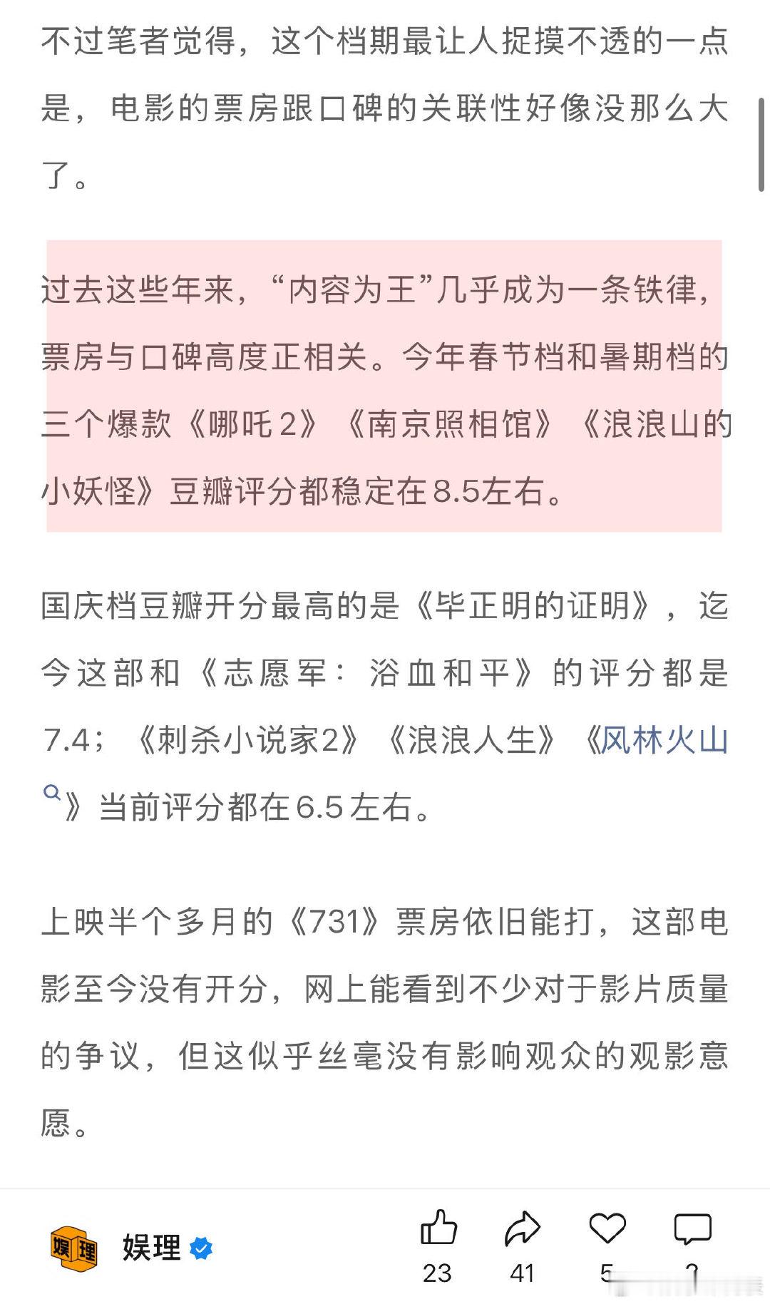 国庆档最大的新鲜感是新面孔 主旋律大片始终是国庆档的主流 《震耳欲聋》在发行资源上不占优势,但打出了一条差异化路线,能够最大化地积攒势能,保住上映首日的排片率、上座率、票房占比。如同影院经理们说的,该片改写了整个档期的格局生态,让后半程的票房走势重生悬念:往年只要假期过半,就基本胜负已分了。娱理独家↓