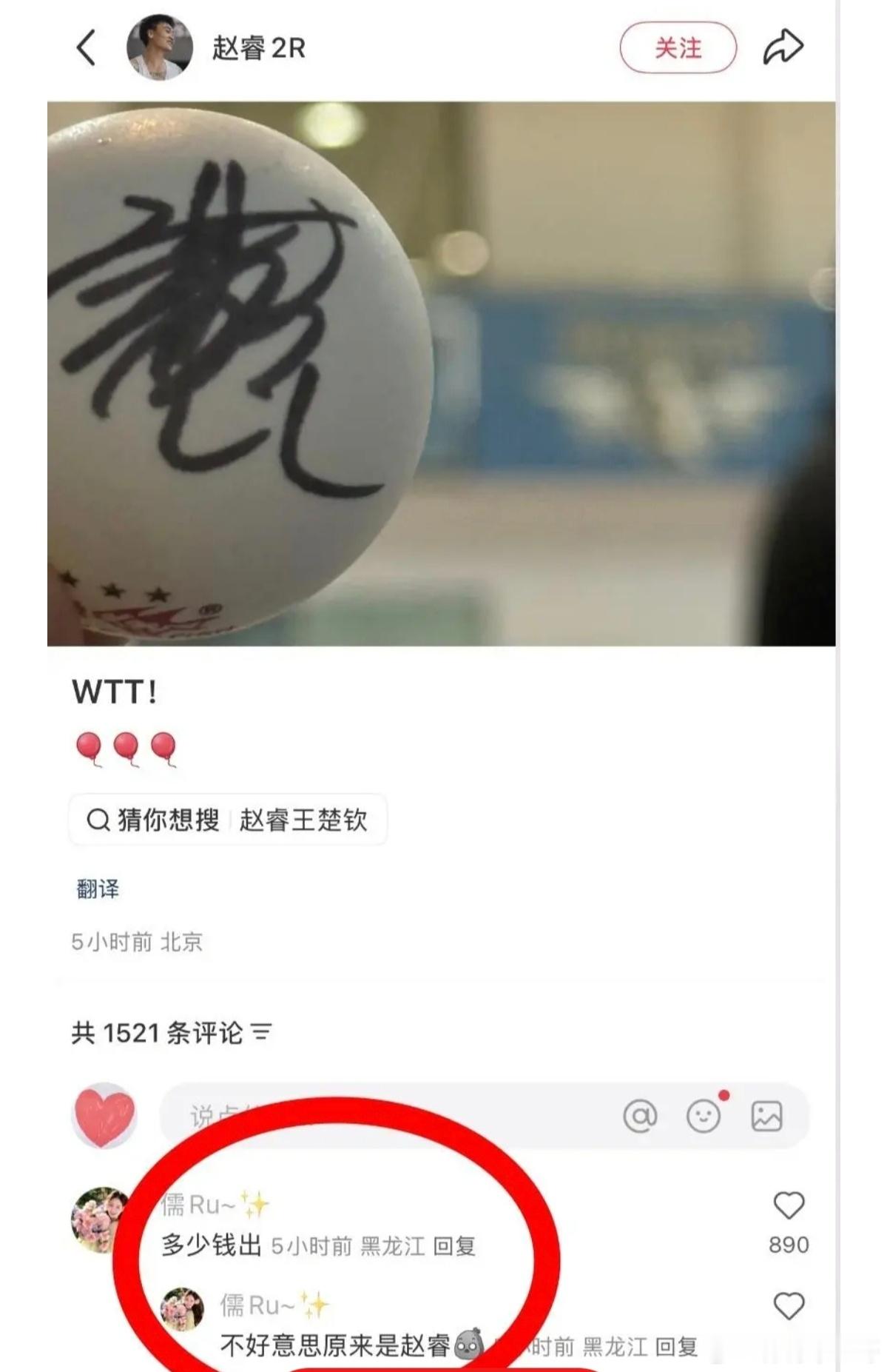 赵睿晒王楚钦签名乒乓球。网友评论问多少钱出?结果发现是正主赵睿![允悲][允悲]