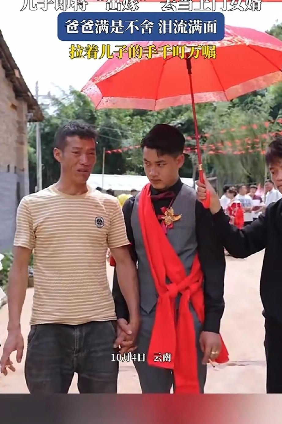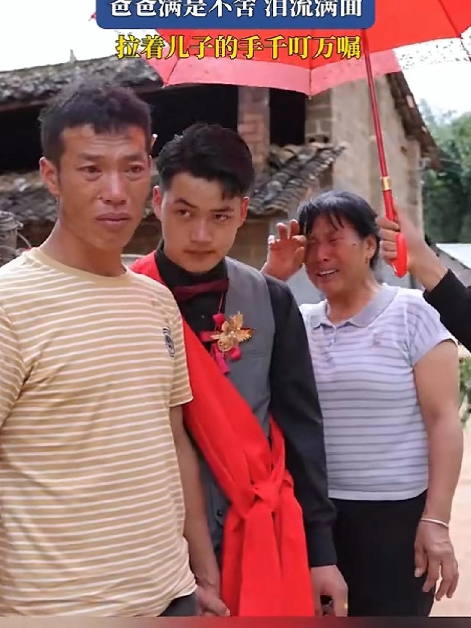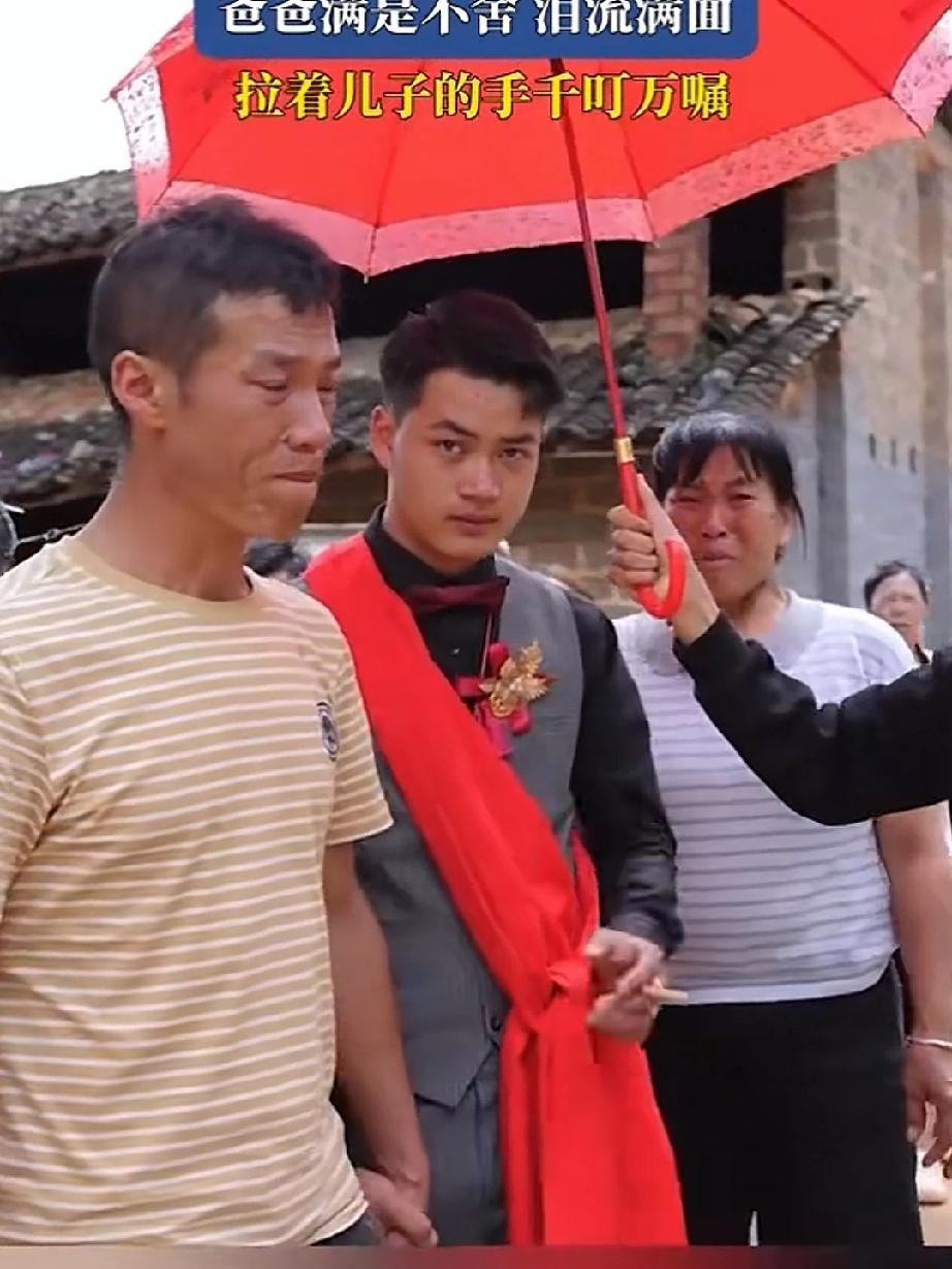 儿子即将“出嫁”去当上女婿,爸爸满是不舍泪流满面,拉着儿子的手千叮万嘱咐!生怕儿子受了气,当上门女婿还不如嫁女儿呢! 这么英俊的小伙子“倒差门” 太委屈他了,爸爸妈妈哭着送别一定是有不得已的苦衷才把儿子“外嫁”,要么家里穷要么哥们多不好说媳妇,才让儿子当了上门女婿,虽然委屈了儿子可这样好歹有个家。 但愿小伙子“嫁”过去后妻子能够真心疼爱他,丈人丈母娘能够把他当亲儿子看待!
